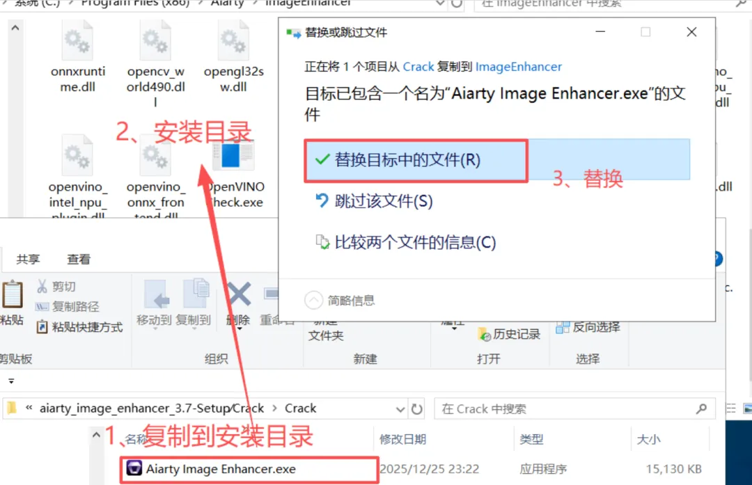 安装完成后,不要打开软件。将“Crack”文件夹内的补丁文件,复制到软件的安装目录下,选择“替换目标中的文件”。