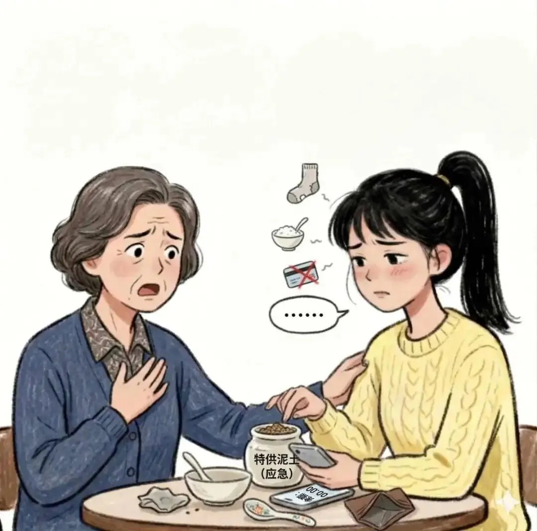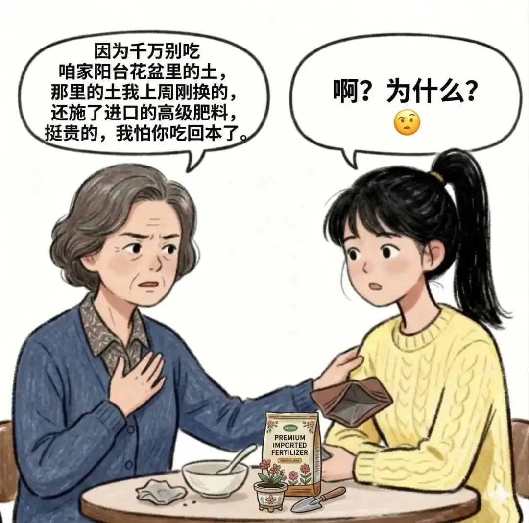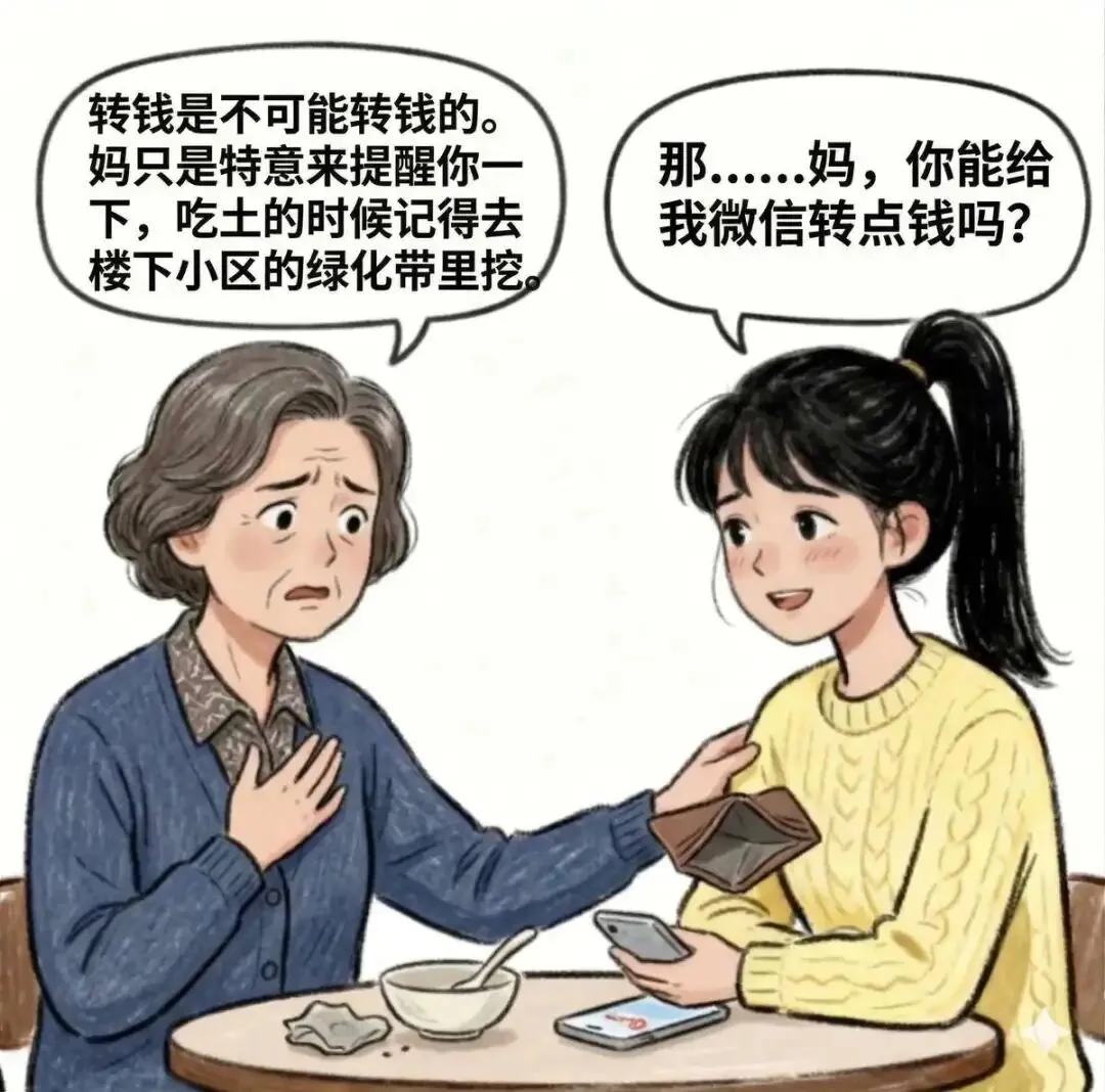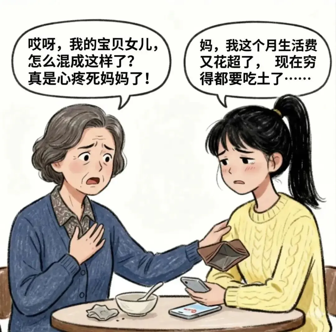 明天漫画:女儿:妈,我这个月生活费又花超了,现在穷得都要吃土了…….妈妈:吃土的时候记得去楼下小区的绿化带里挖.