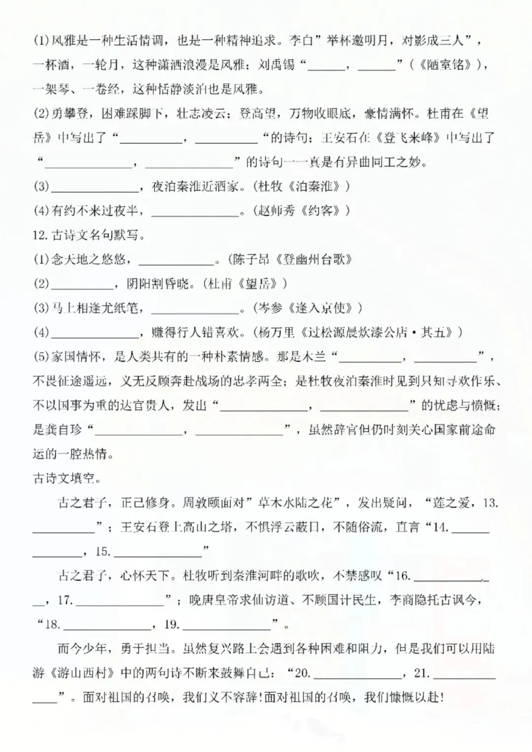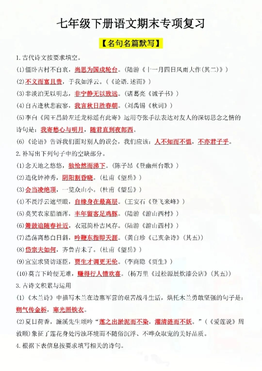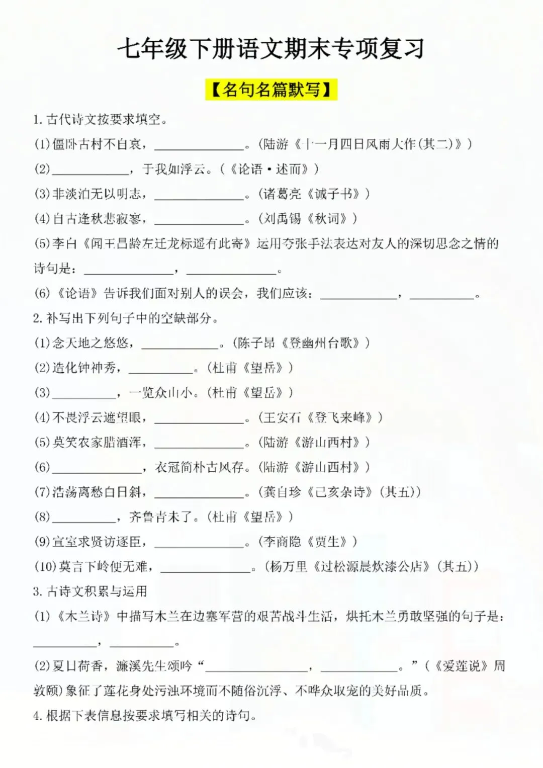 今天老师给大家整理了:七年级下册语文名句名篇默写复习 电子版可打印!