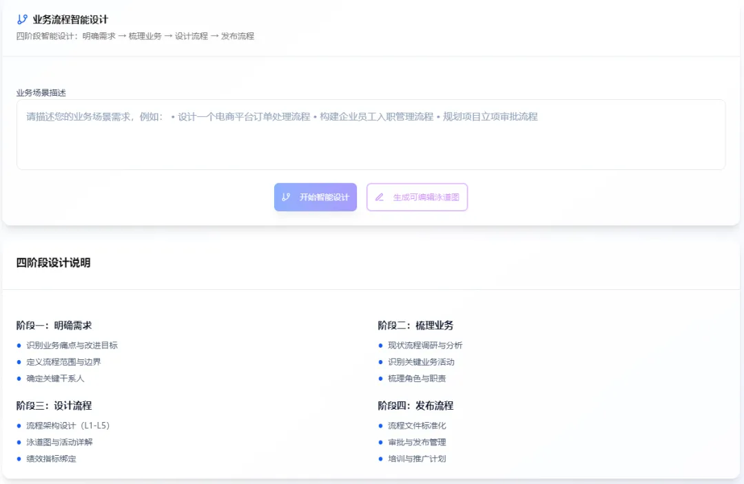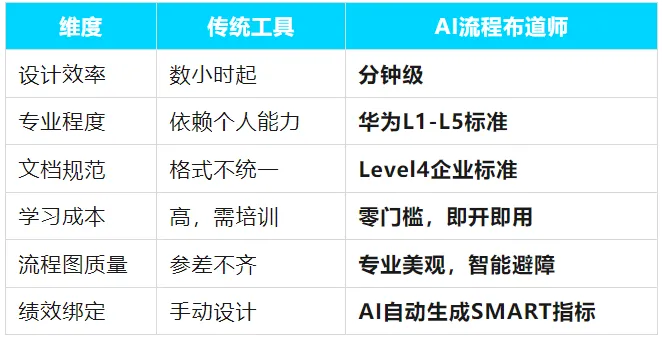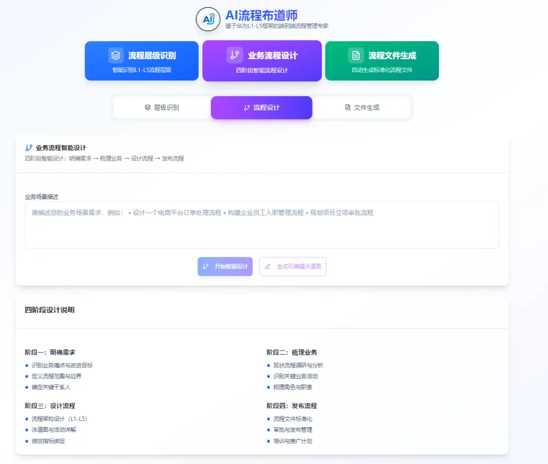今天,我们正式发布 AI流程布道师 —— 一款基于华为L1-L5框架的端到端流程设计系统,用AI重新定义流程设计体验。