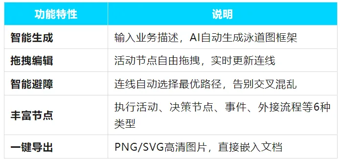 📌市场空白:目前市面上没有一款工具能生成如此规范、美观、功能完善的泳道流程图!