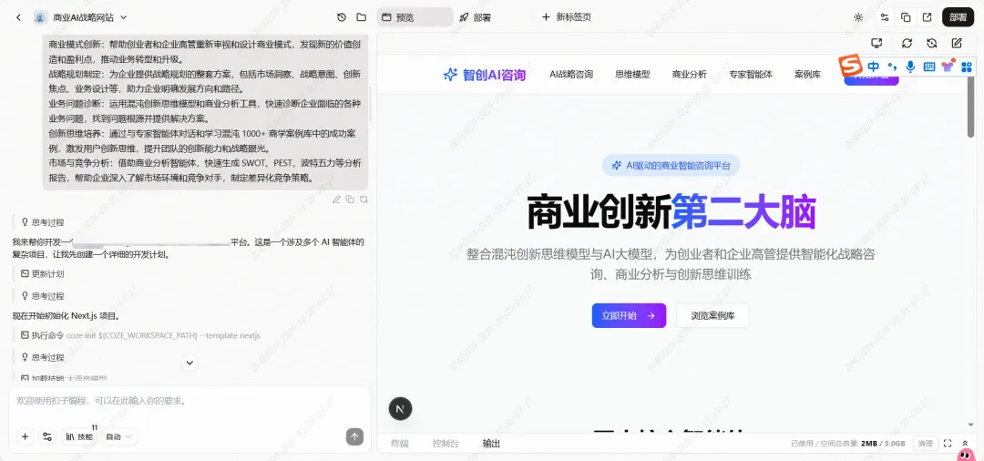 PS2(非广告,真心推荐小白使用):本网站是用扣子编程进行快速开发部署,完全通过对话形式边对话,边开发,边看效果,边调试。效果是超出我期望的。(下图是我开发另一个是网站的过程图片),