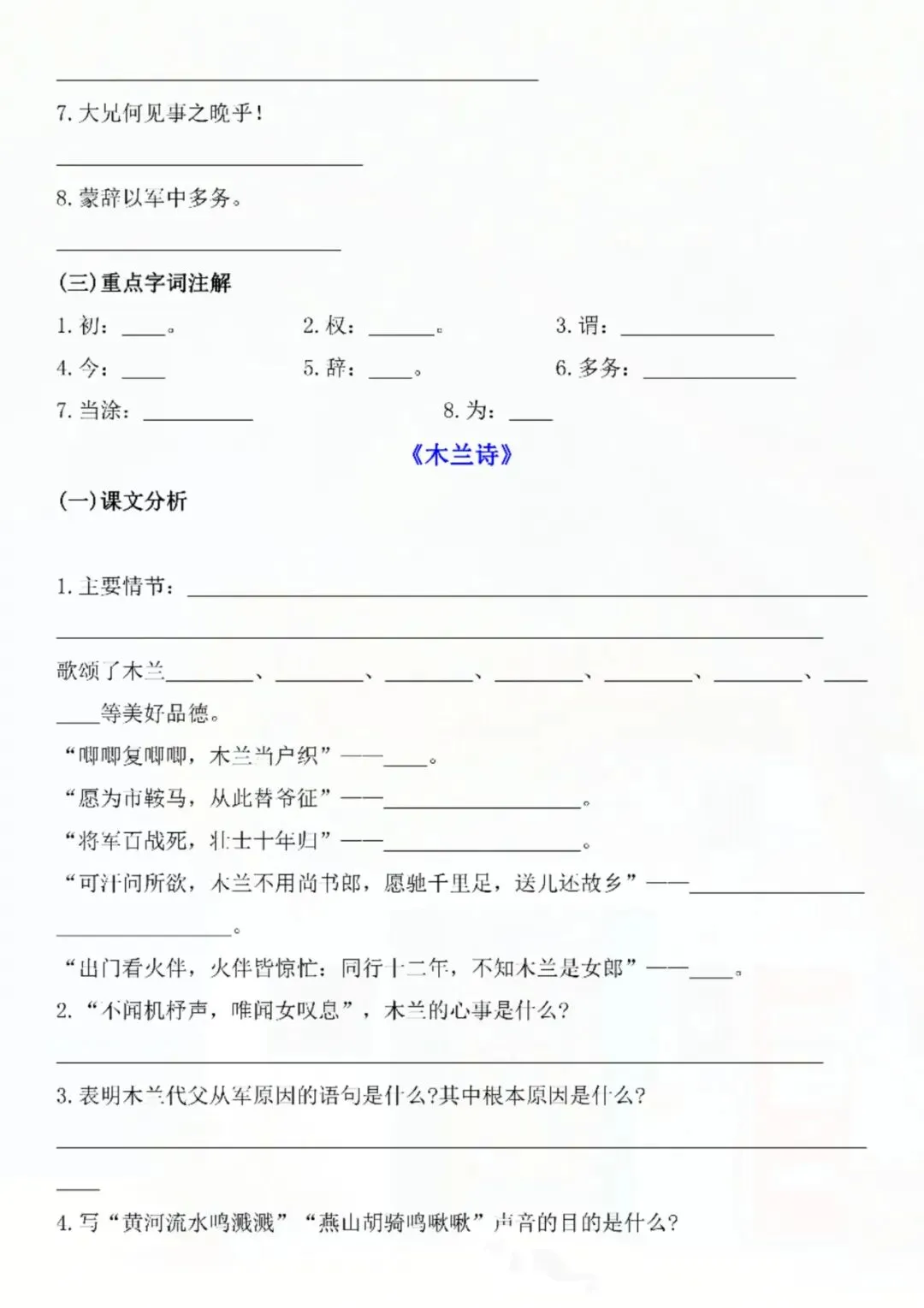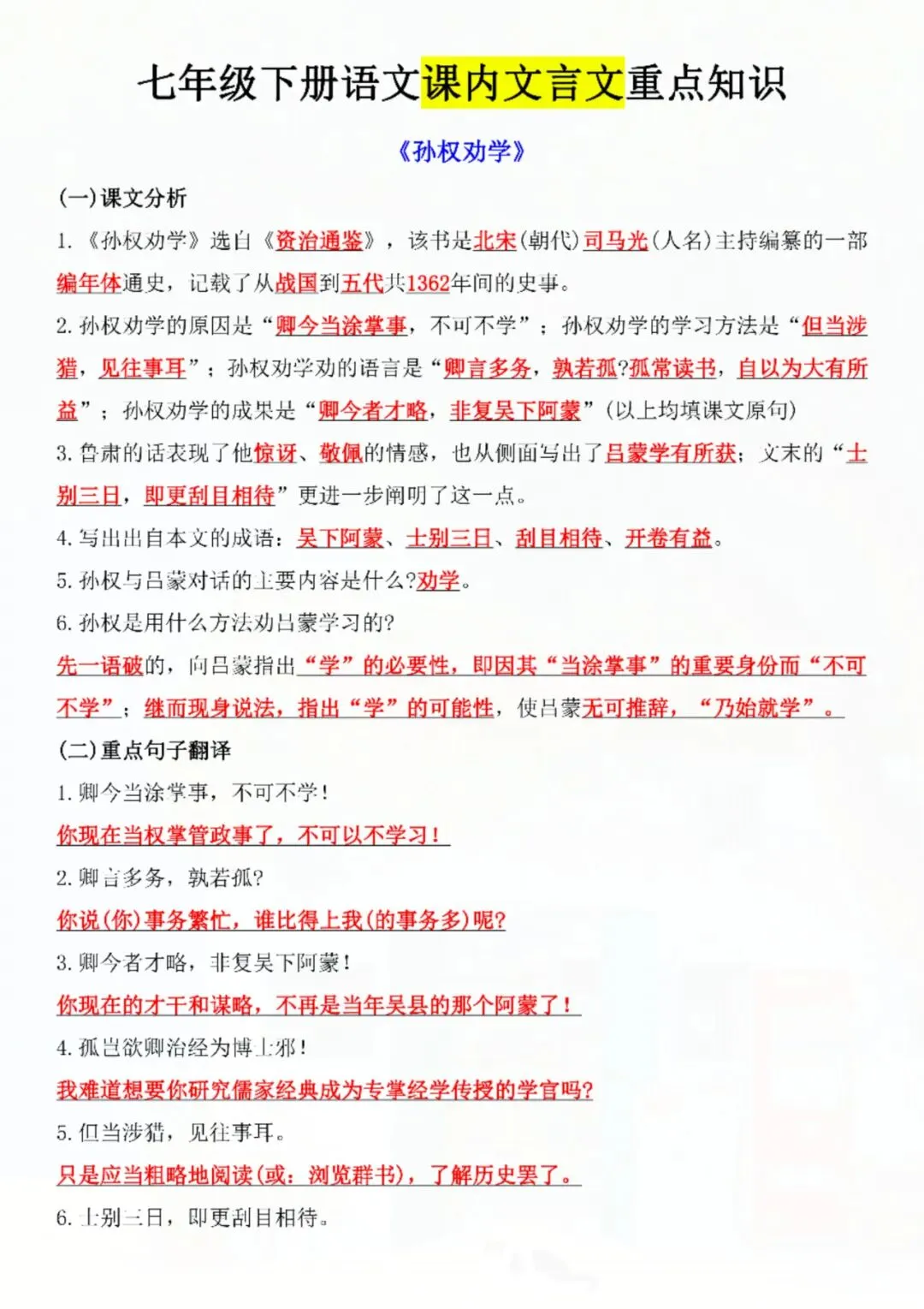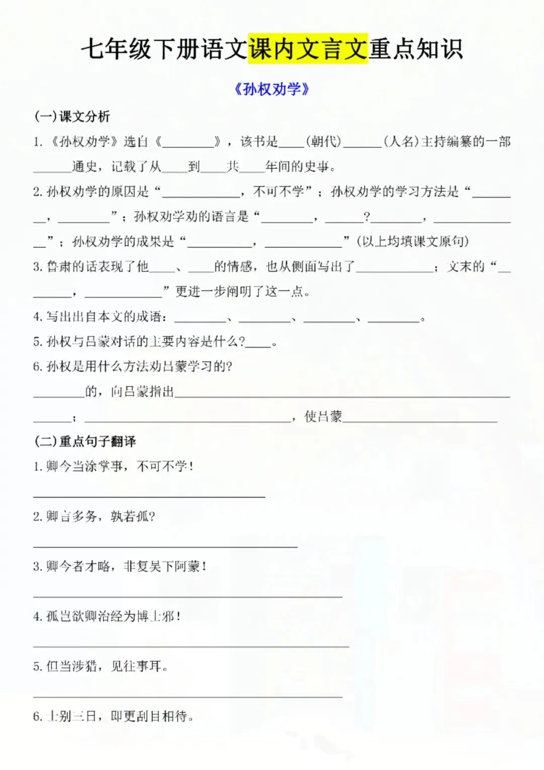 今天老师给大家整理了:七年级下册语文课内文言文重点专训 电子版可打印!