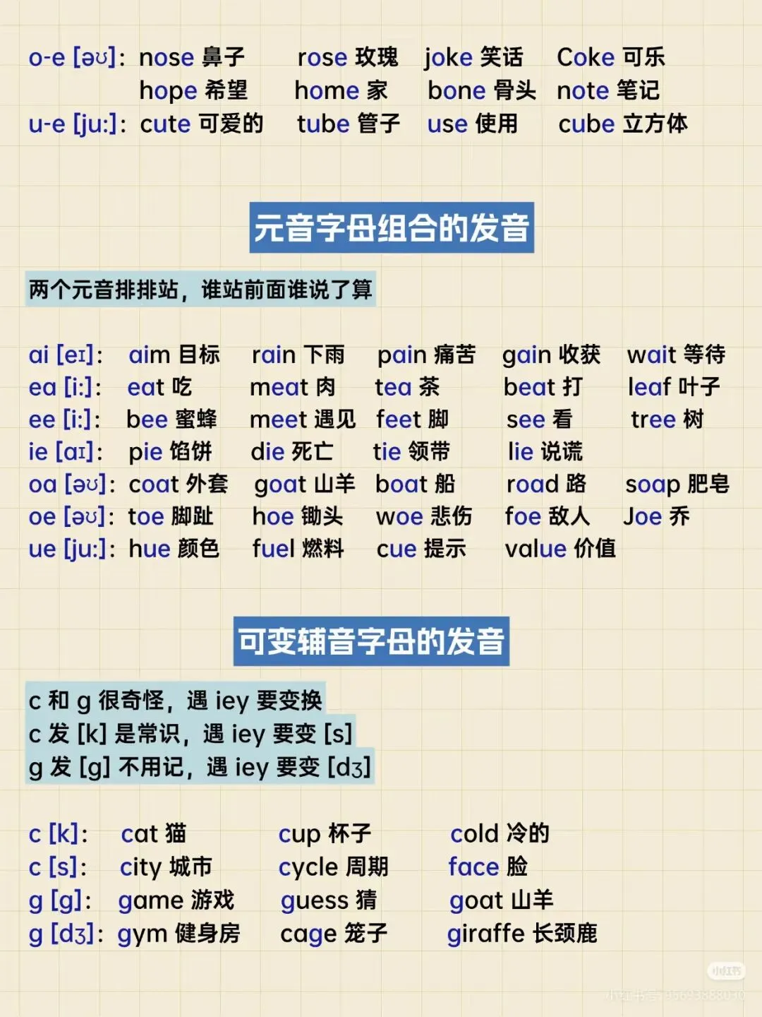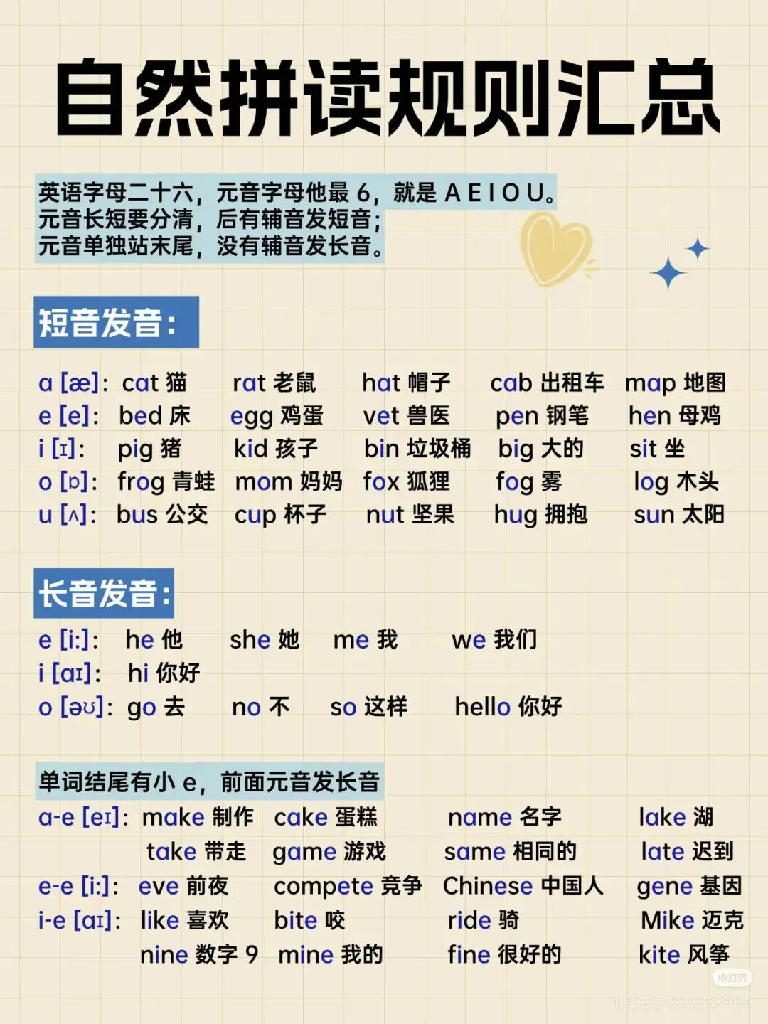 涵盖元音字母(短音、长音)、辅音字母组合及所有特殊发音规律,告别零散学习。 - 举例详实,即学即用:
