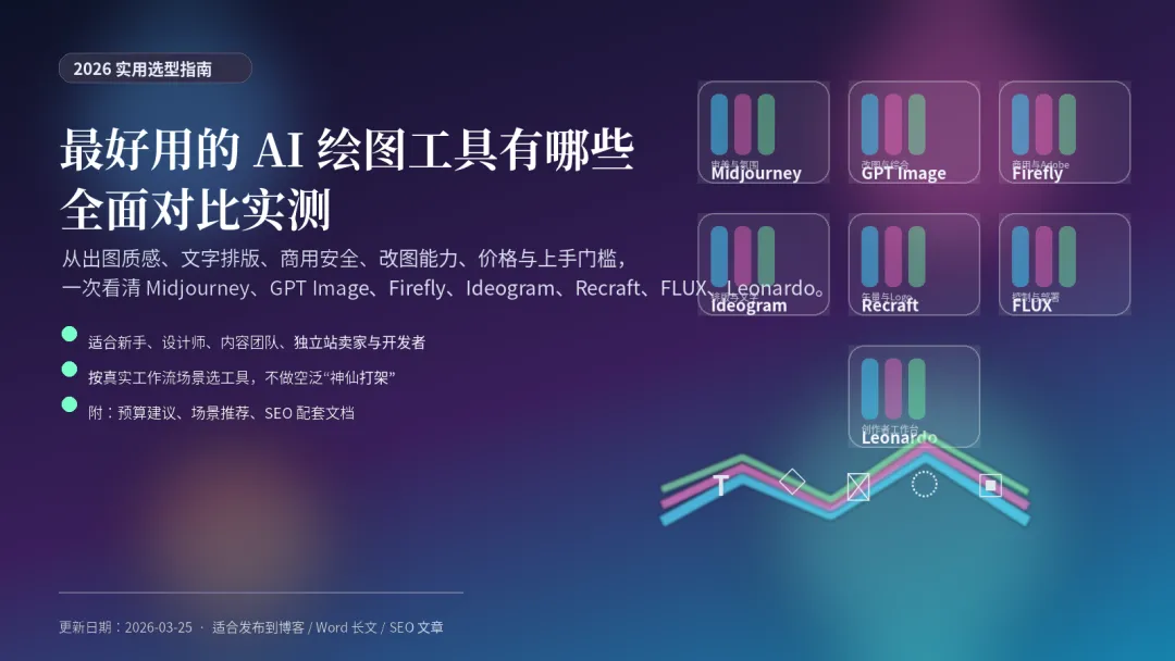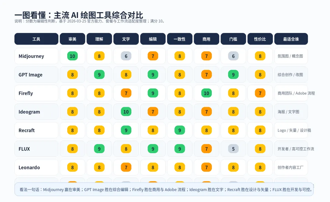 按真实工作流拆解 Midjourney、GPT Image、Adobe Firefly、Ideogram、Recraft、FLUX、Leonardo 与 DreamStudio 的优缺点、价格逻辑与适用人群。