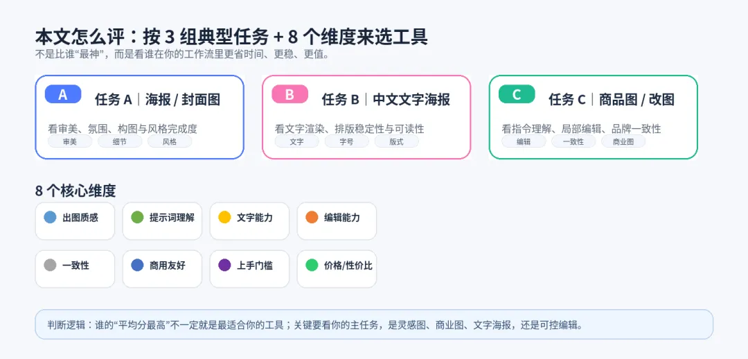 本文不做空泛排行榜,而是按统一评价维度来拆:出图质感、提示词理解、文字能力、编辑能力、一致性、商用友好、上手门槛、价格/性价比。你会看到一个更实用的结论:没有绝对最强,只有最适合你当前工作流的工具。