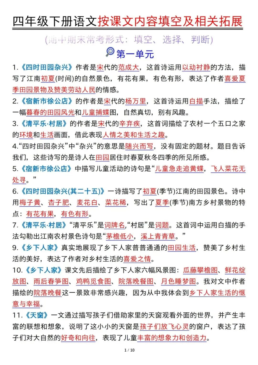 四年级下册语文预习,抓对重点真的很省心,按课文内容填空就是预习的好帮手。这份资料覆盖1-8单元,不光有课文填空练习,还有相关知识拓展,答案也都整理齐全,PDF格式方便打印,整整20页。孩子提前练一练,上课跟着老师学,理解起来更轻松,课文掌握也更扎实。