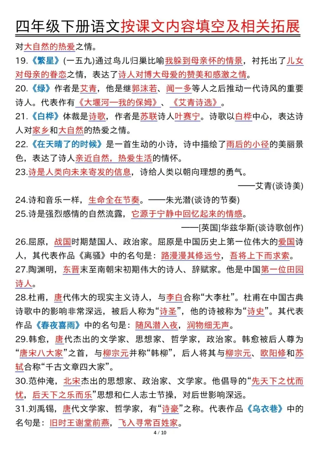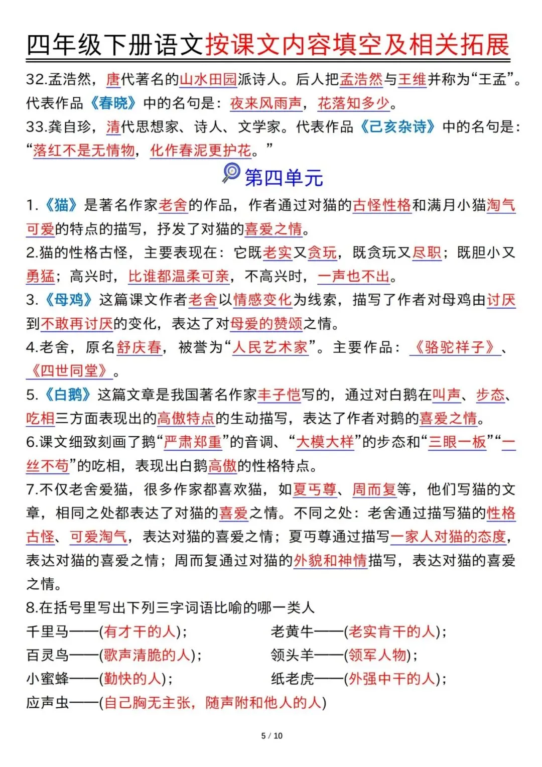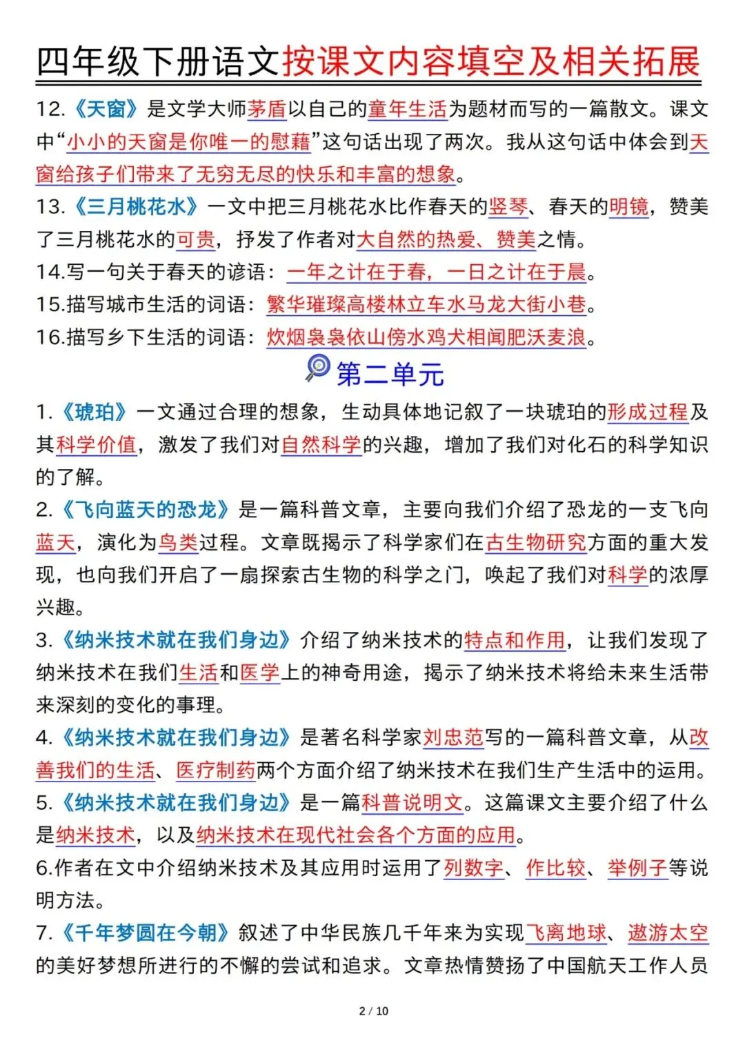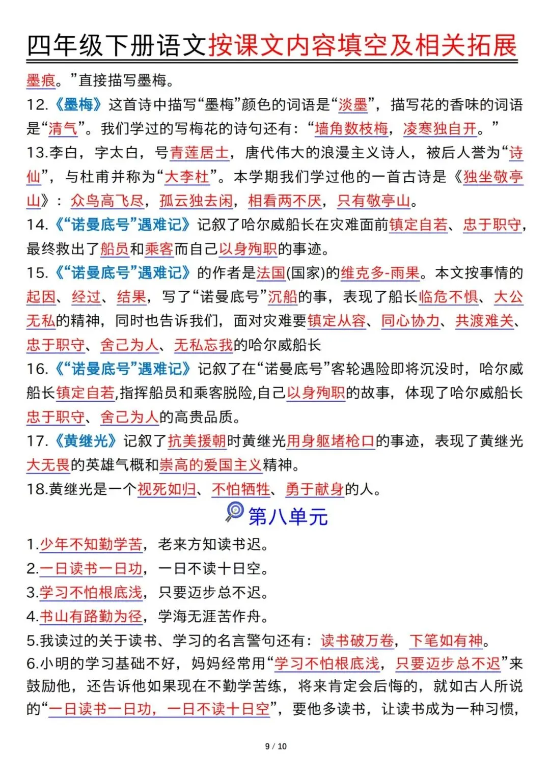 预习神器!四年级下册语文1-8单元按课文内容填空及拓展含答案PDF可打印20页