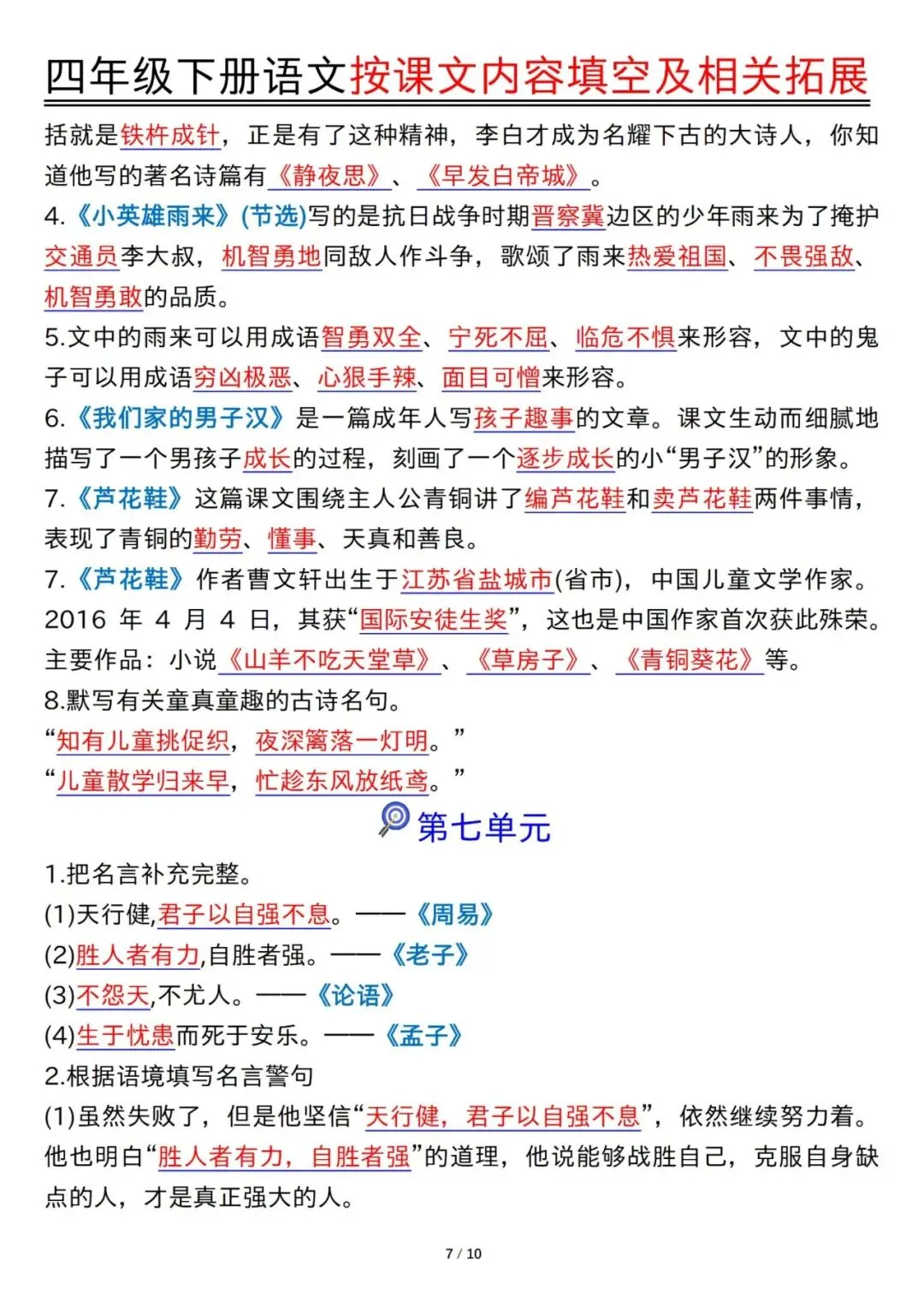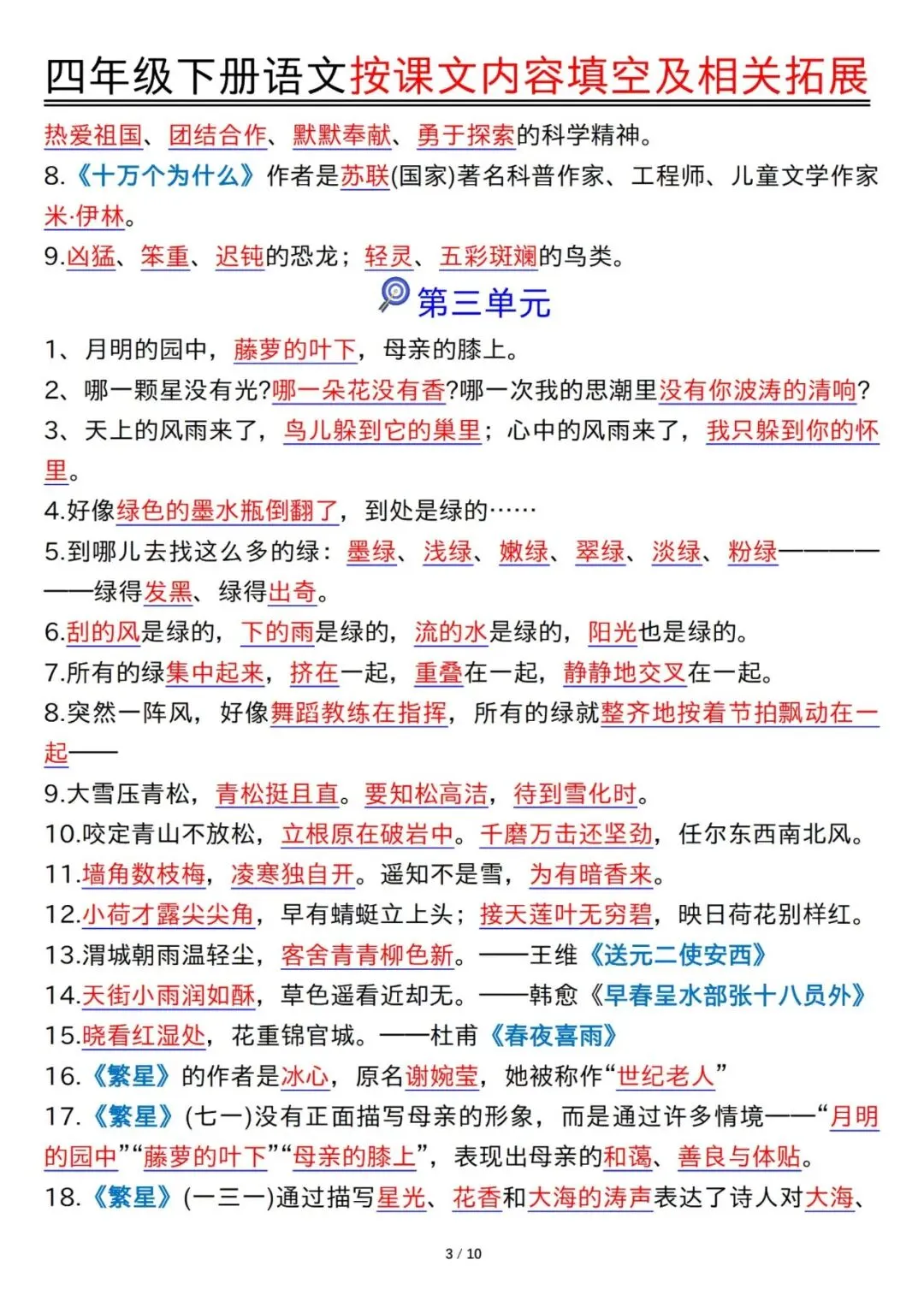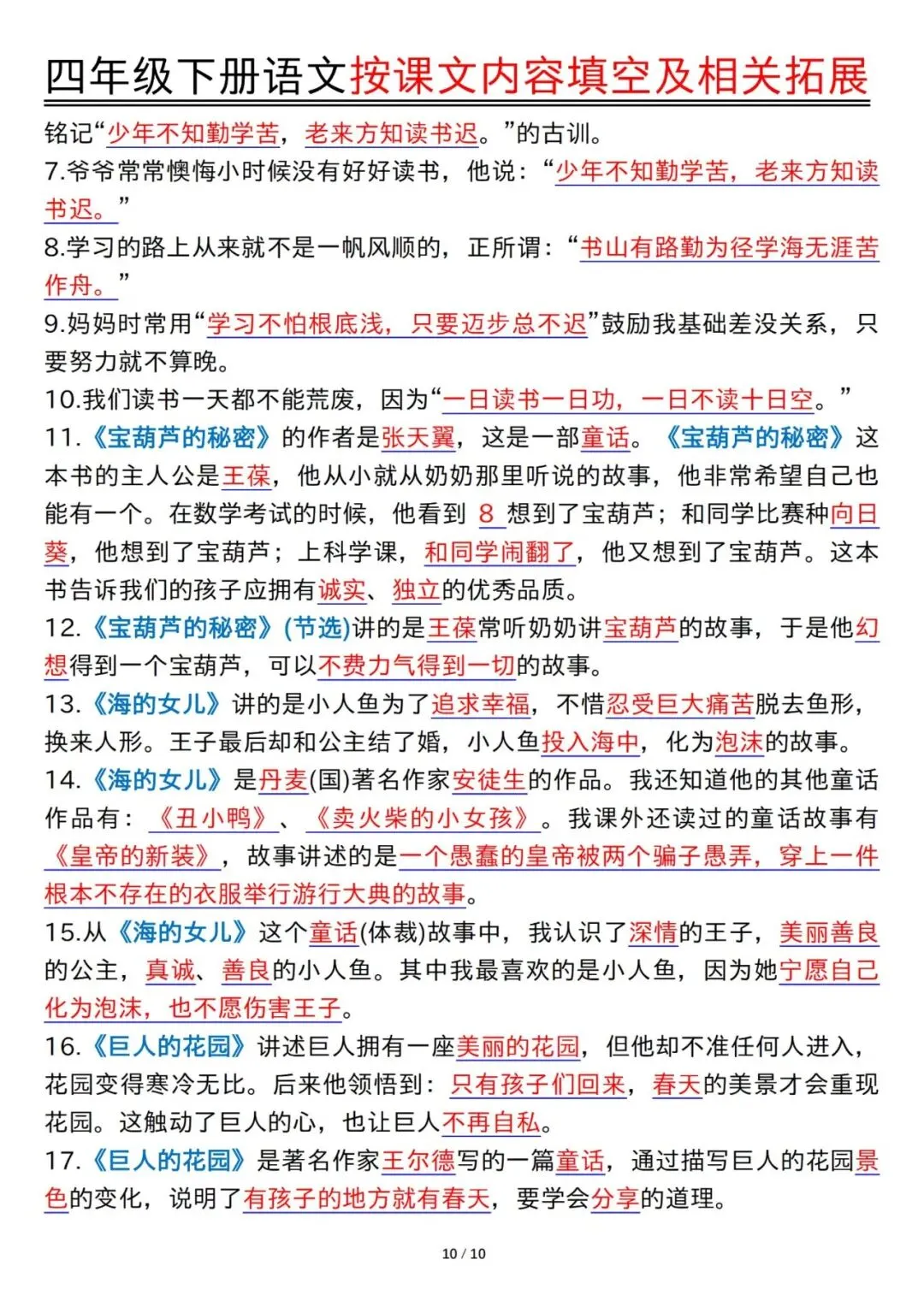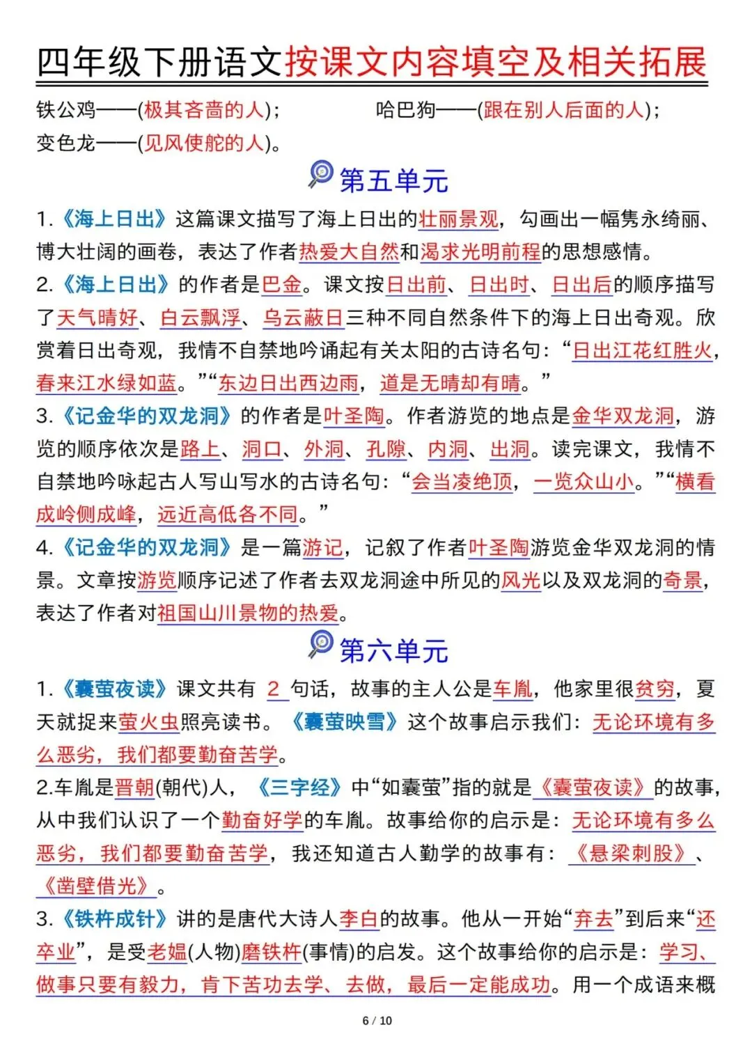 预习神器!四年级下册语文1-8单元按课文内容填空及拓展含答案PDF可打印20页
