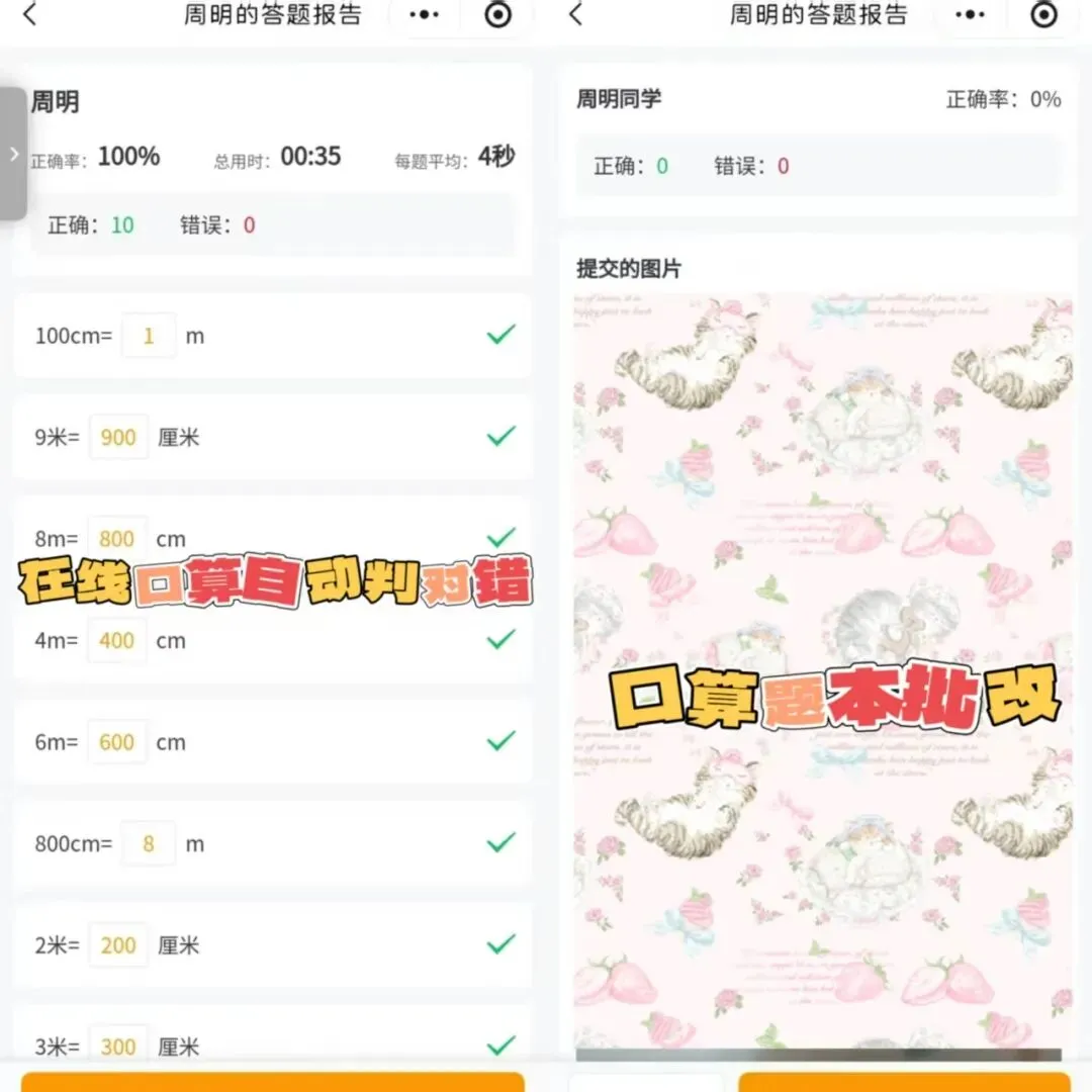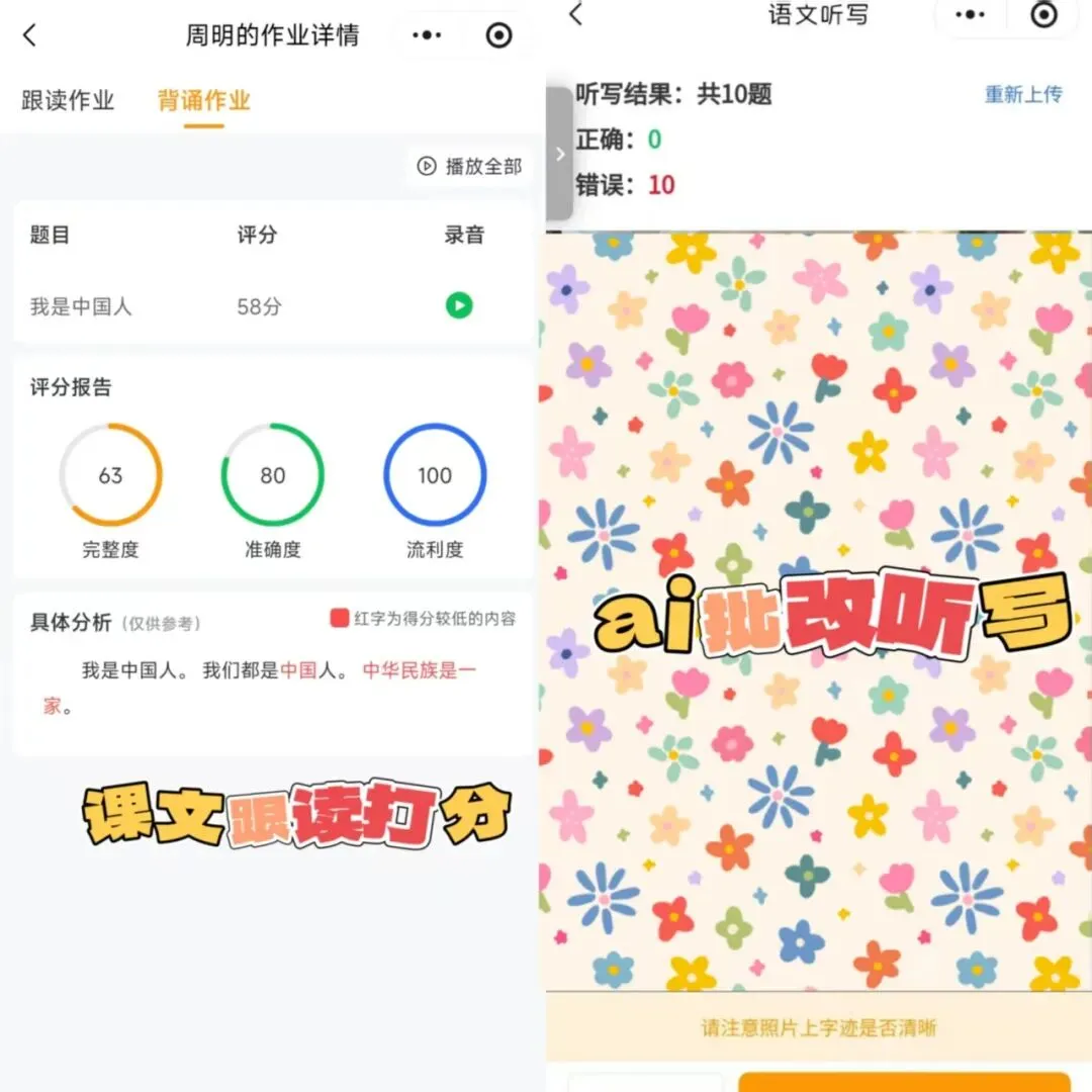 老师能一键发布语文英语的跟读、听写、背诵任务,系统自带标准发音示范,通过 AI 语音评价技术,从准确度、完整度、流利度三个维度给学生录音打分,哪里读错了标得明明白白,不用老师逐个听;数学口算练习支持按知识点自动出题,学生在线做或拍照上传手写答案,AI 3 秒就能改完,还能生成错题报告,哪个知识点弱一目了然。