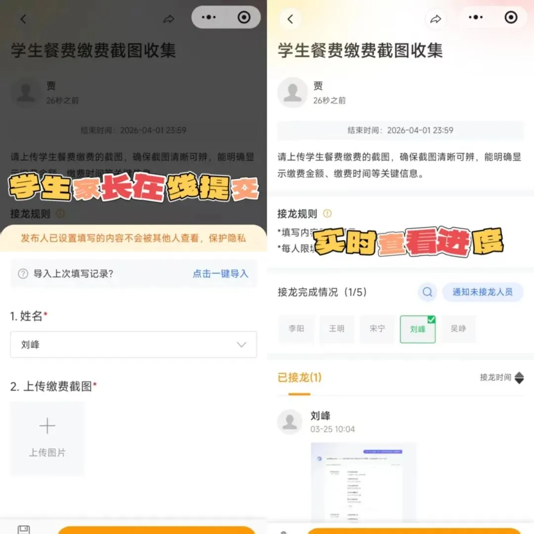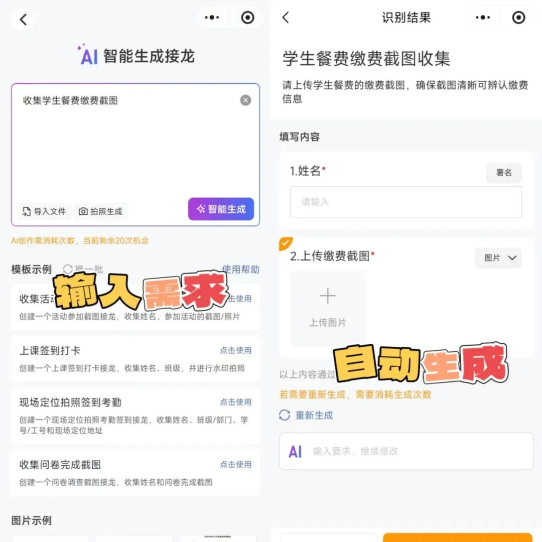 老师只要说需求(比如 “收学生餐费缴费截图”),AI 10 秒生成带所有字段的接龙页面,点一下就能发班级群。