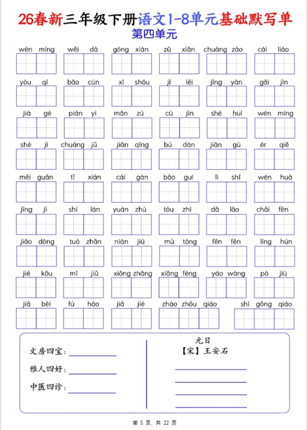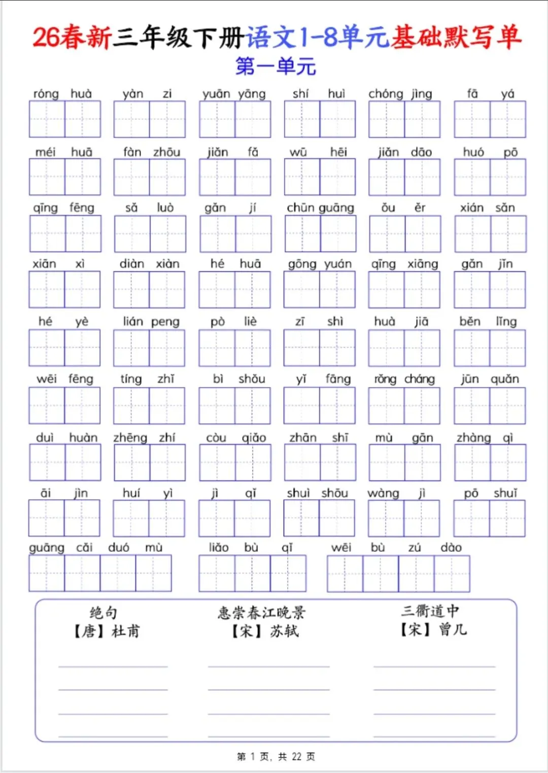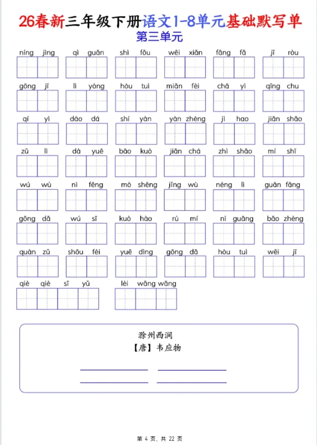 26春三年级下册语文1-8单元基础默写单 电子版可打印