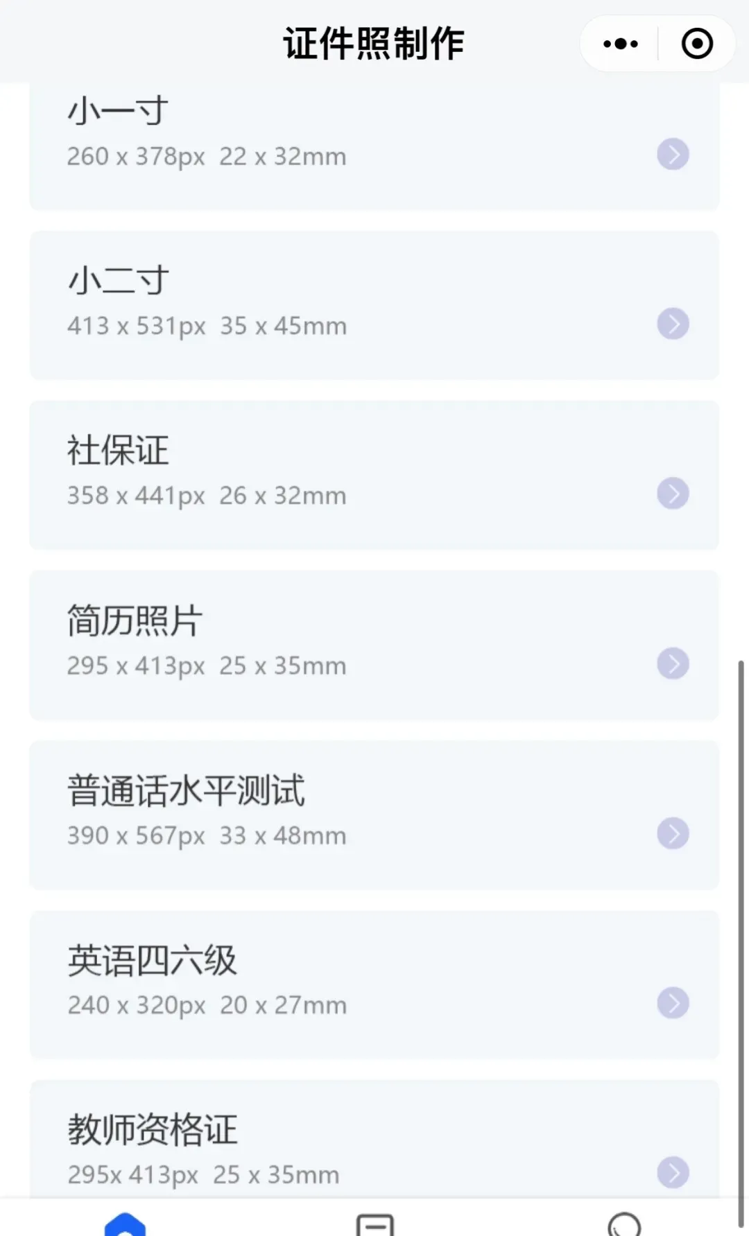 可以直接进入常用寸照进行尺寸选择,或者点击下方热门证件照向上滑,里面除了有常用寸照以外,还有社保证、简历照片、普通话水平测试、英语四六级、教师资格证选项等。