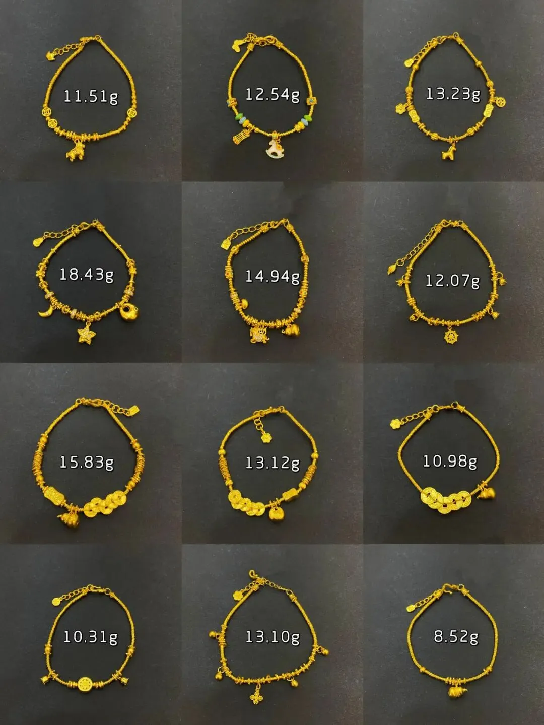 不同克重的款式各有特色,有的搭配了小吊坠更灵动,有的是纯盘缠设计更经典,戴在手腕上金灿灿的,显白又显贵气,日常搭衣服或者叠戴都超好看‼️