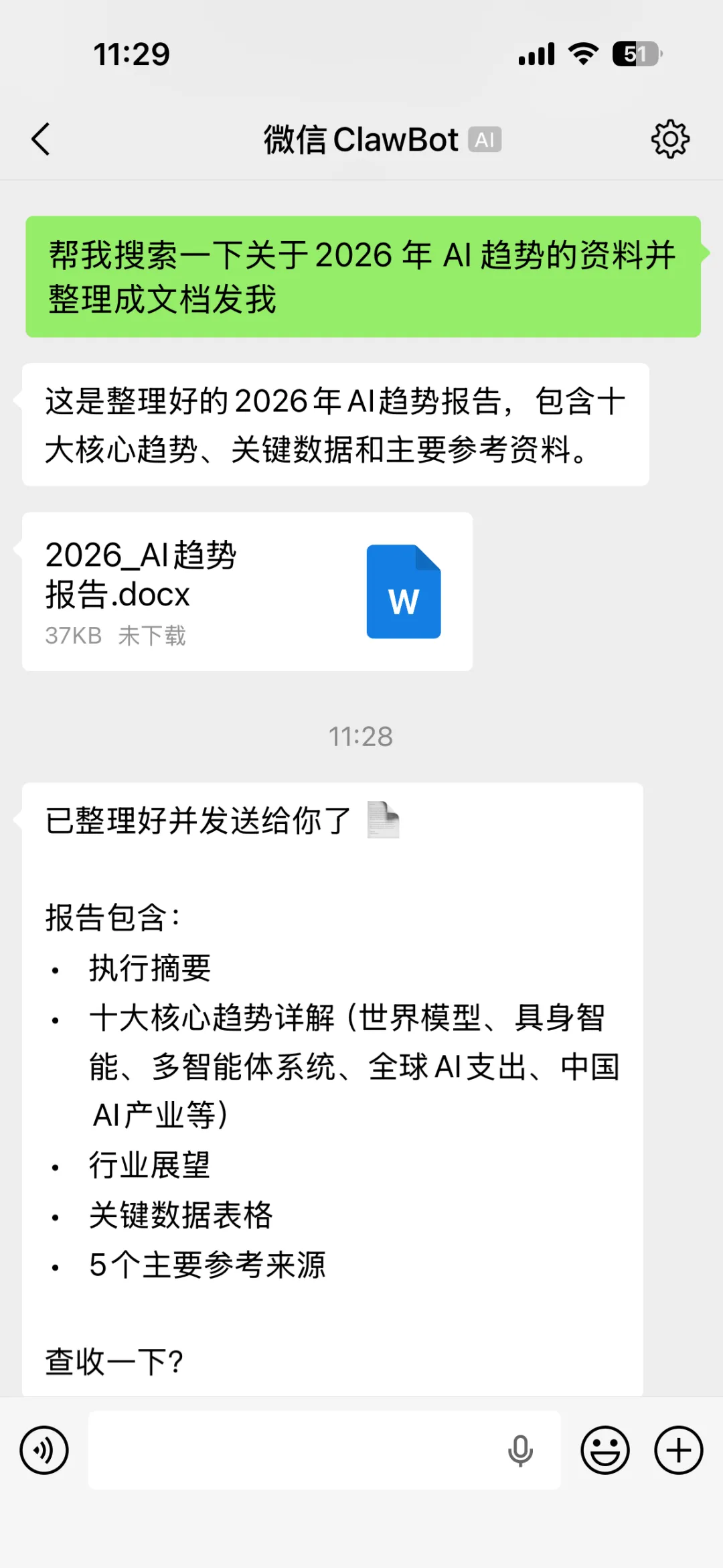 可以看到,我只需在微信里像日常聊天一样发送指令,它就能联动 OpenClaw 帮我完成,免去连设备、受环境等因素困扰,上手也十分方便,换在以前都不敢想象。