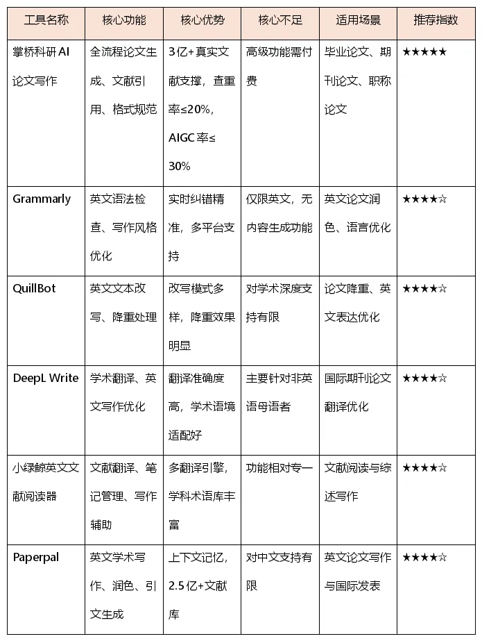 如果你是科研新手或时间紧迫的在职人员,掌桥科研AI论文写作的全流程覆盖和低查重率特性最为实用;需要优化英文表达的研究者,Grammarly和DeepL Write是必备补充;而经常处理外文文献的学者,小绿鲸能显著提升文献处理效率。