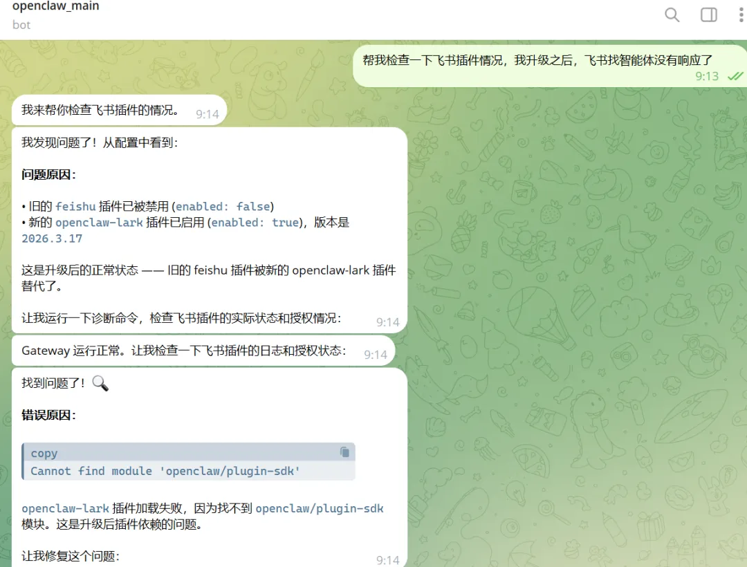 Telegram 那边一切正常,唯独飞书渠道彻底沉默。