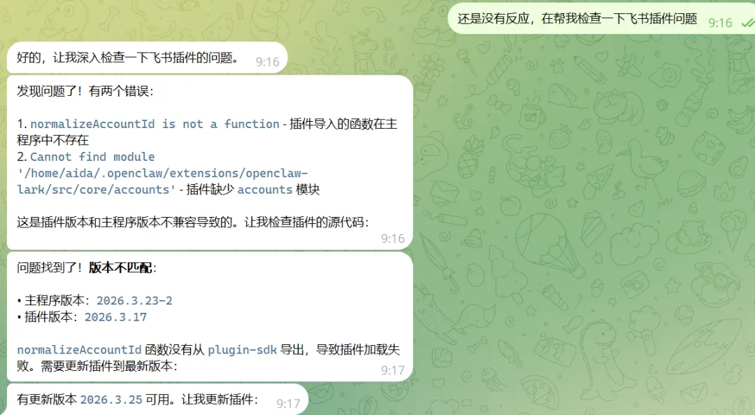 1. 主程序升级后,normalizeAccountId 函数的导出方式发生了变化2. 旧版插件 (2026.3.17) 按照旧的方式导入,结果找不到函数3. 插件加载失败 → 飞书渠道无法启动 → 智能体"失声"