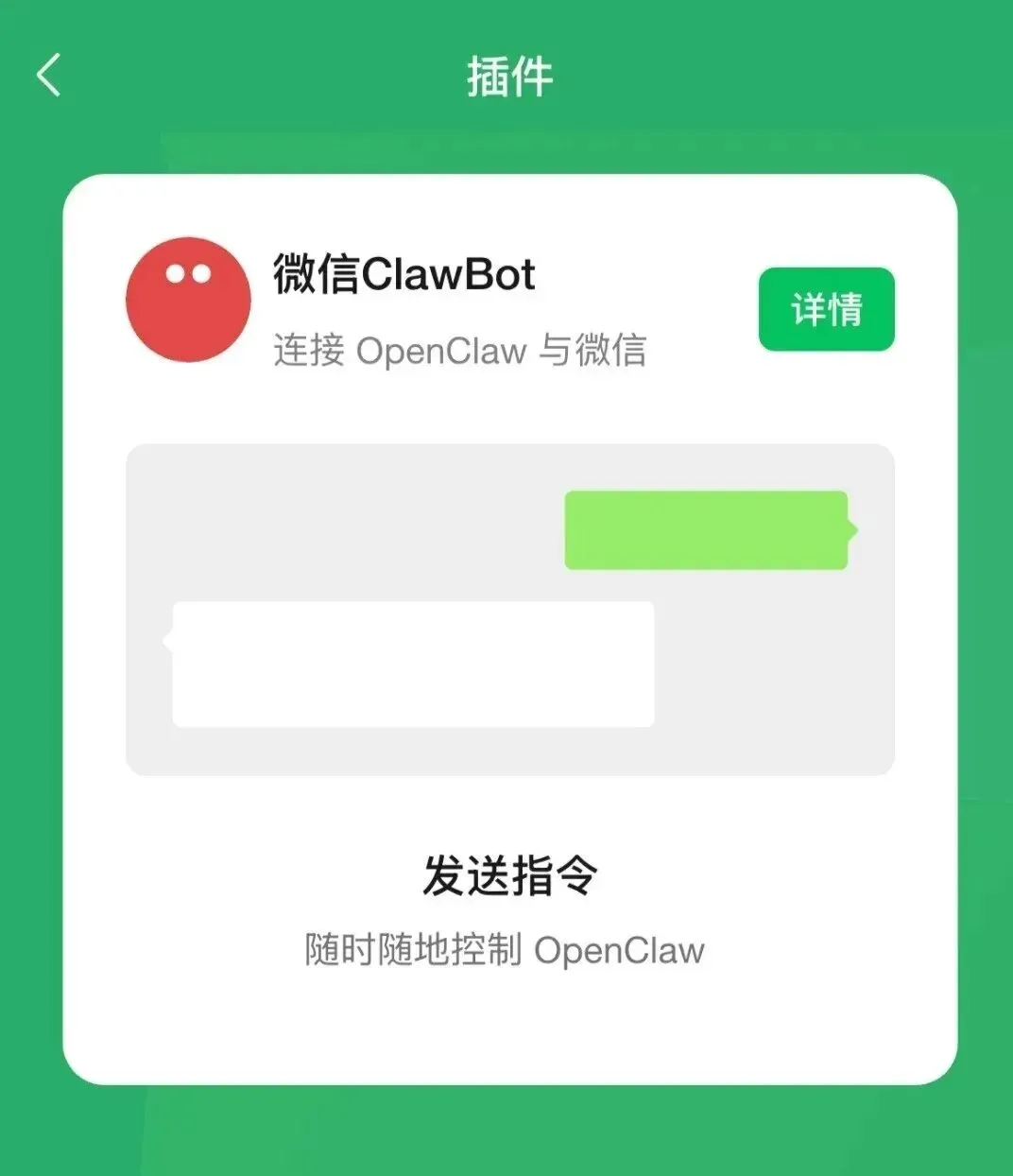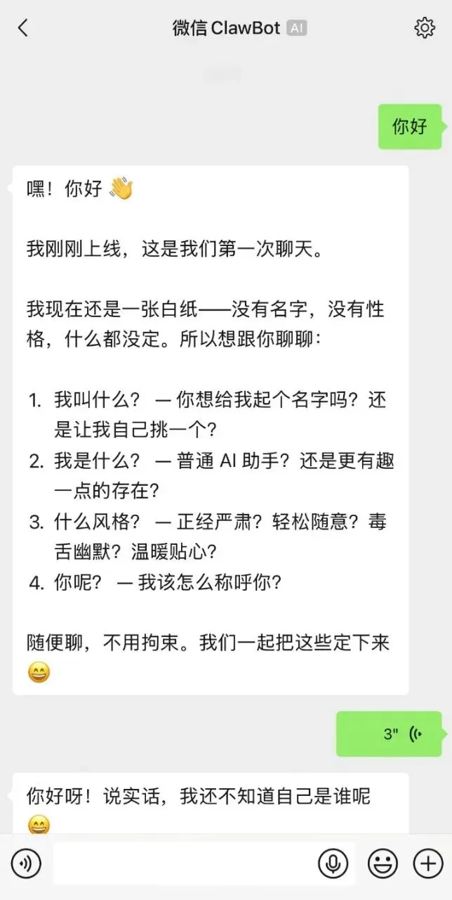 扫码完成后,添加,将直接进入到微信ClawBot的对话页,此时已经可以直接跟它对话了: