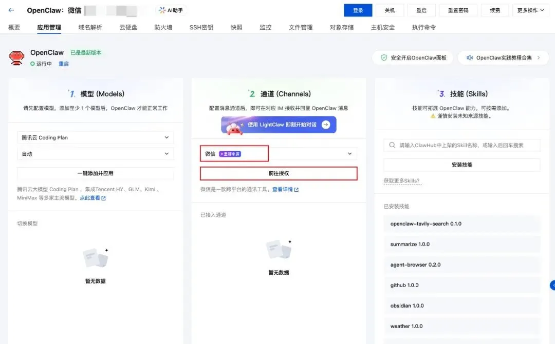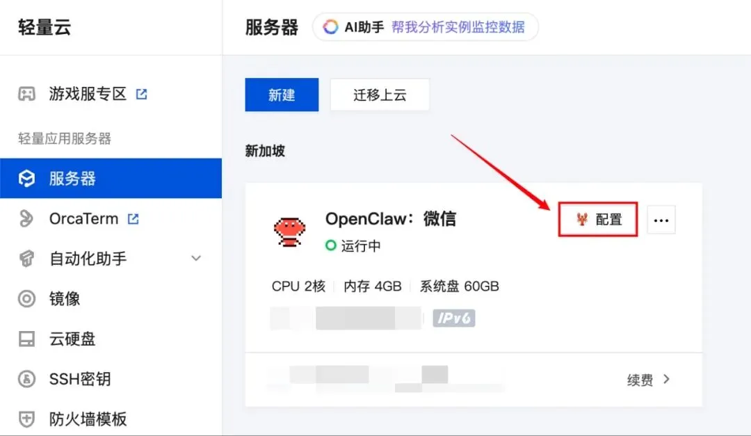 打开并登录腾讯云Lighthouse控制台,找到你希望接入微信的OpenClaw实例,单击实例卡片的配置按钮,进入应用管理页: