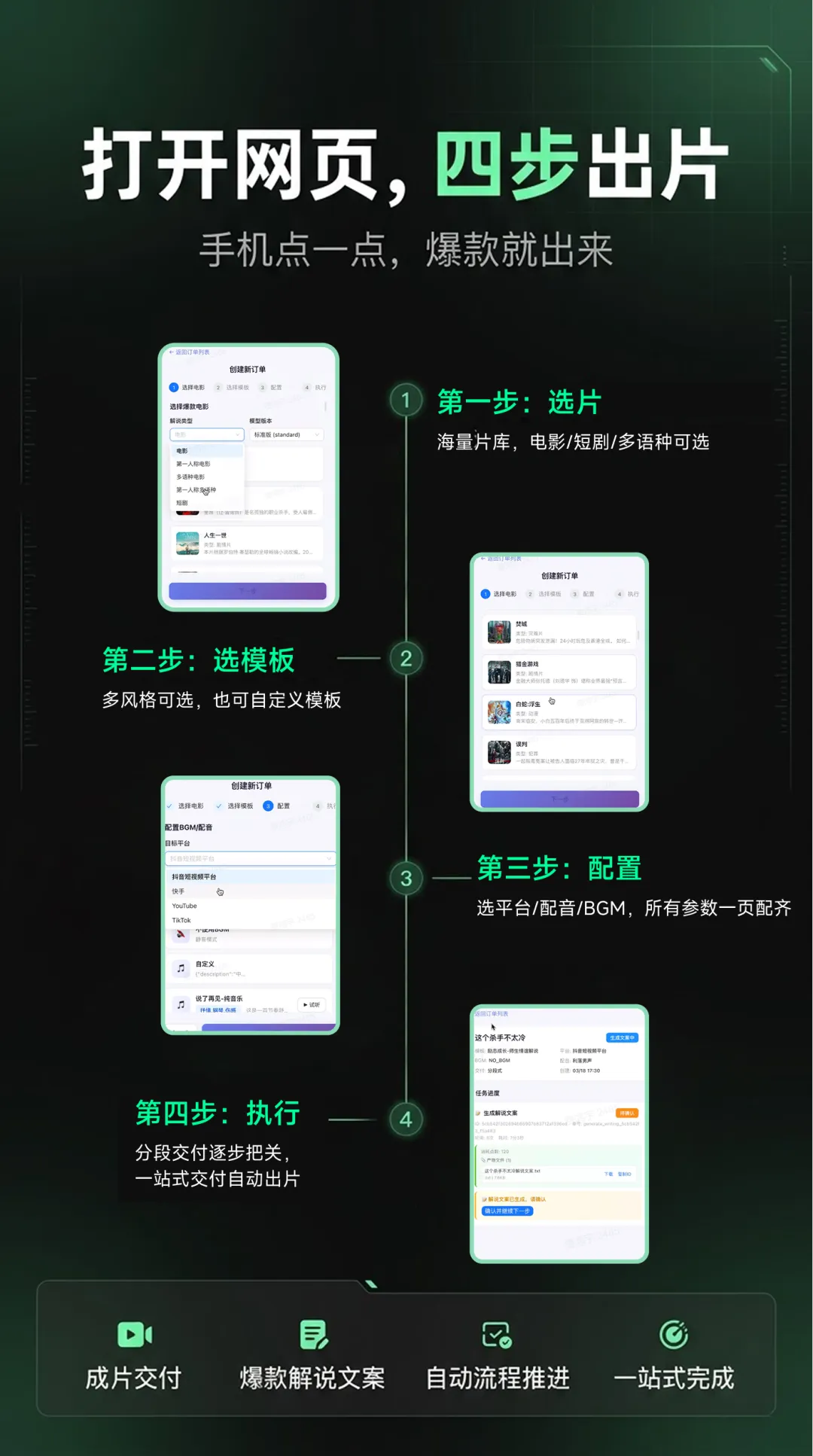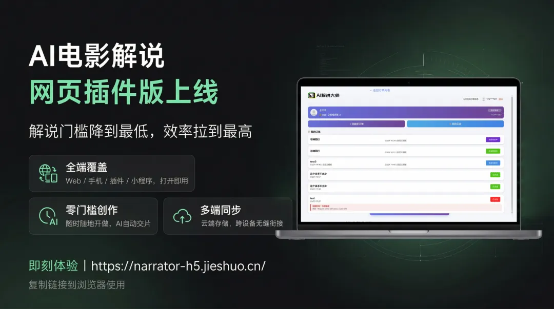 • 真正的零门槛开工手机打开网页,就能做电影解说。你口袋里的手机,就是一个完整的AI解说工作站。 -