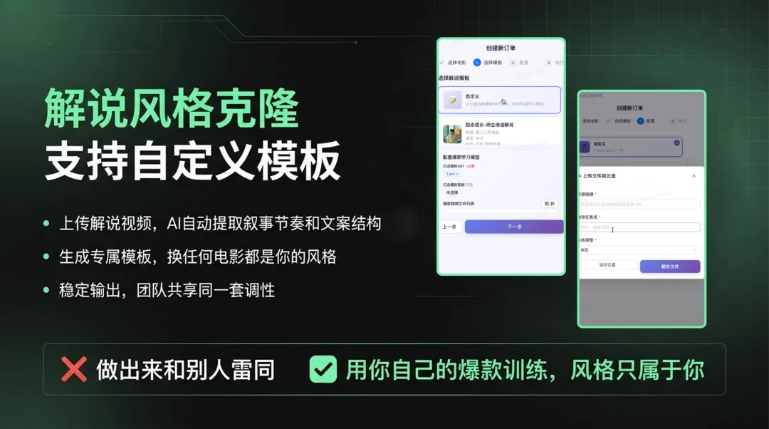 现在,你可以通过上传自己的爆款视频,AI自动提取你的叙事节奏、语气习惯和文案结构,生成一套只属于你的专属模板, 换任何电影都能输出你独有的调性。