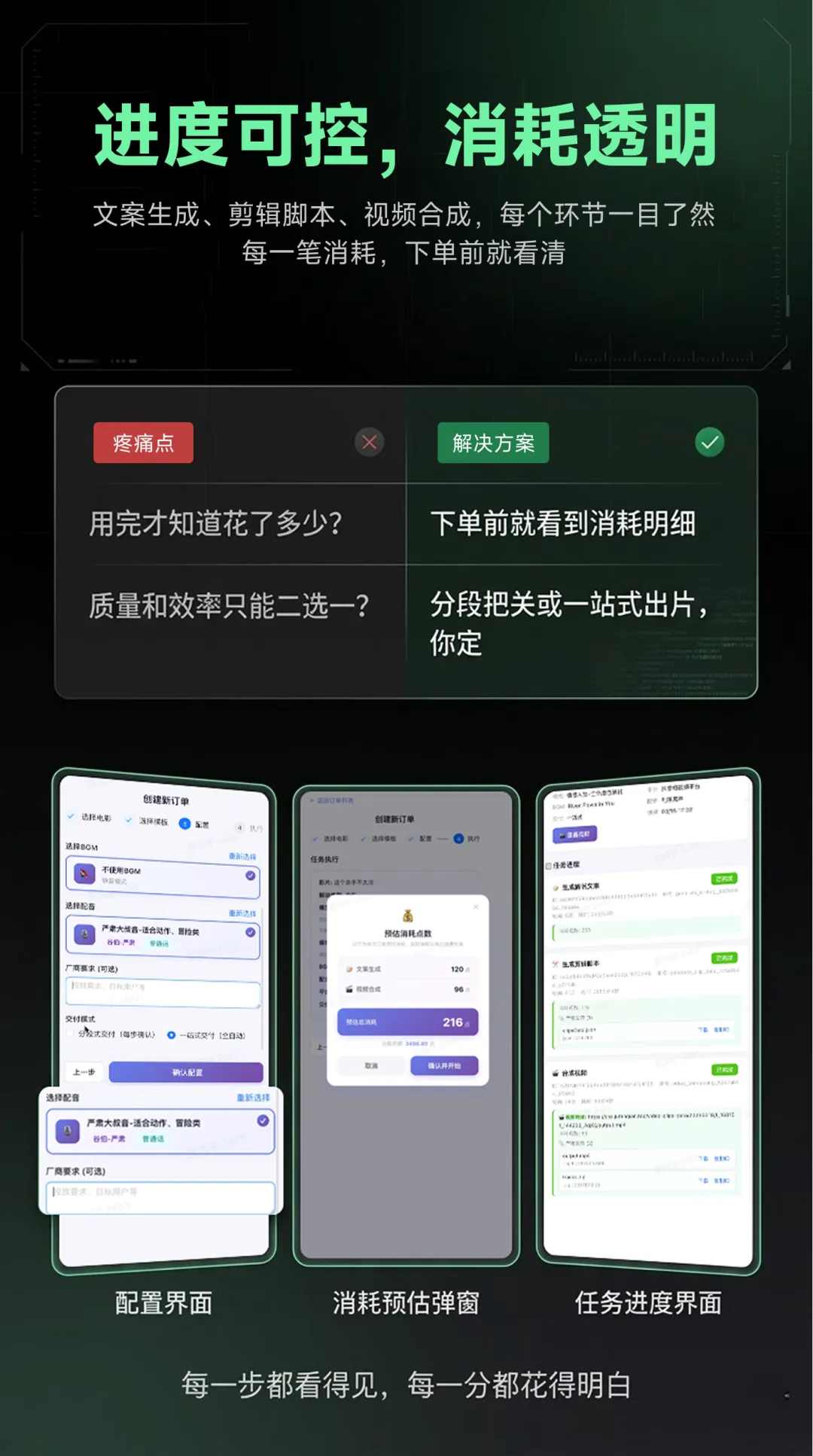 在别的平台,你可能剪完才知道花了多少。但在AI解说大师,下单前就有精确的消耗明细。 文案、合成、配音,每一分钱都花得明明白白。