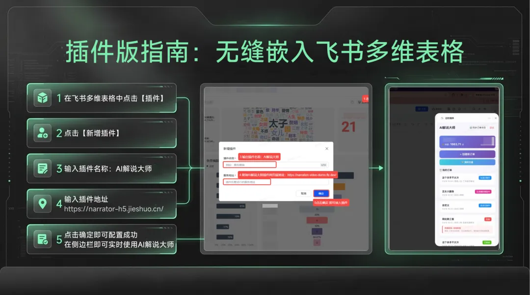飞书用户参考上图插件配置指南,5步完成嵌入,即配即用。