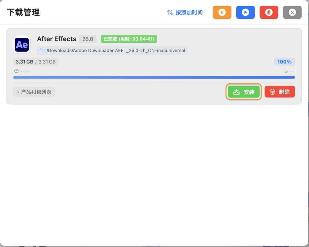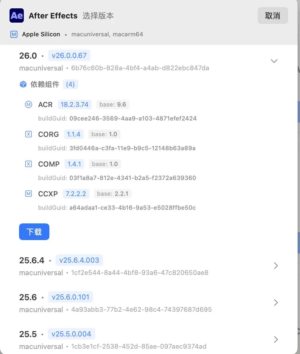 2.2 我们以AE 26.0版本为例, 点击下载按钮。