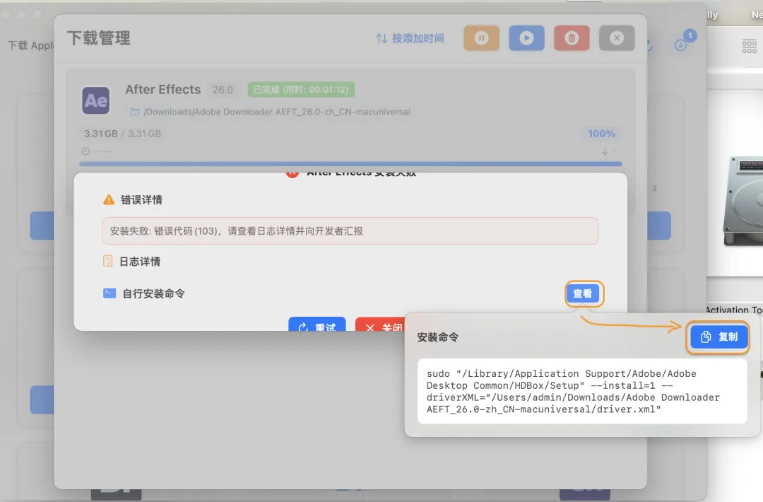 2.6 万一遇到安装失败提示,就先点查看然后点复制。
