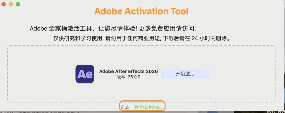 3.6 日志旁的绿字: 激活成功完成;大功告成,尽情发挥AE的后期效果吧!
