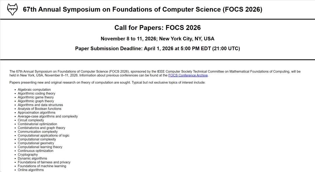 会议介绍:FOCS 2026是IEEE计算机学会主办的年度理论计算机科学顶级会议,覆盖算法、复杂性、密码学、量子计算等核心理论方向。该会议将于2026年11月8日至11日在美国纽约举行。
