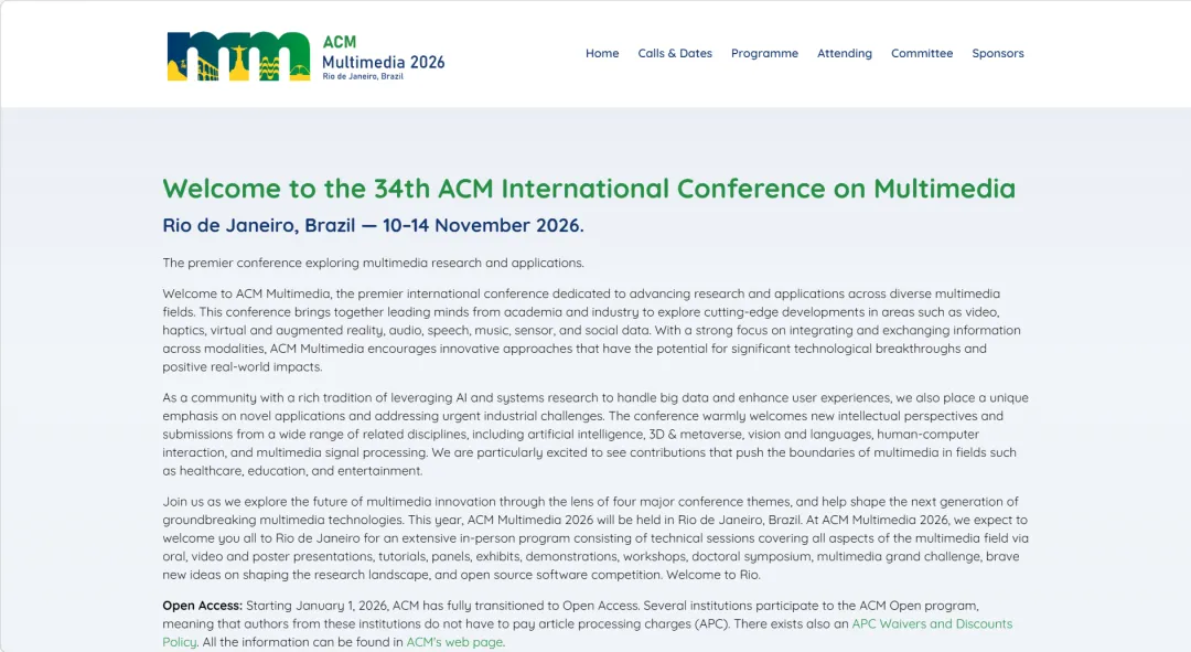 会议介绍:多媒体领域国际顶级会议,将于2026年11月10-14日在巴西里约热内卢举办。会议汇集学术界和工业界顶尖人才,探索视频、VR/AR、音频、语言、音乐等前沿技术,推动多媒体创新应用。