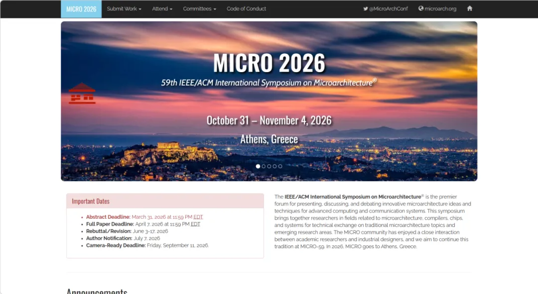 会议介绍:第59届国际微架构研讨会,由IEEE/ACM联合主办,是微架构领域的顶级学术论坛。会议将于2026年10月31日在希腊雅典举行,涵盖微架构、编译器、硬件/软件接口等前沿研究方向,并首次增设工业轨道促进产学研交流。