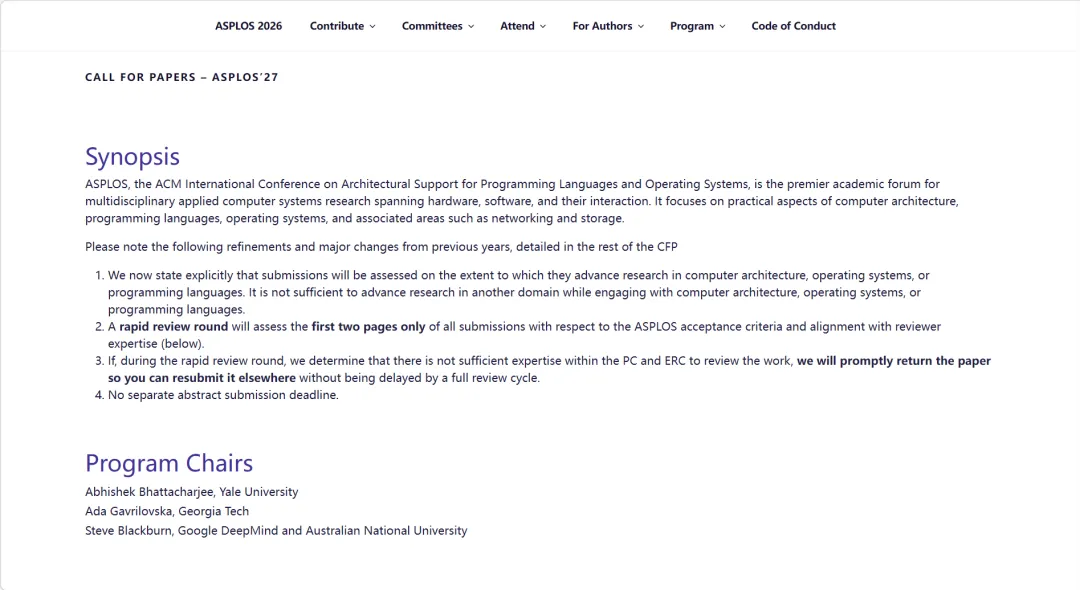 会议介绍:ASPLOS 2027是第32届编程语言与操作系统体系结构支持国际会议,将于2027年在希腊克里特岛举办。作为ACM旗下的顶级跨学科学术论坛,它聚焦计算机架构、编程语言、操作系统及网络存储等领域的创新研究。
