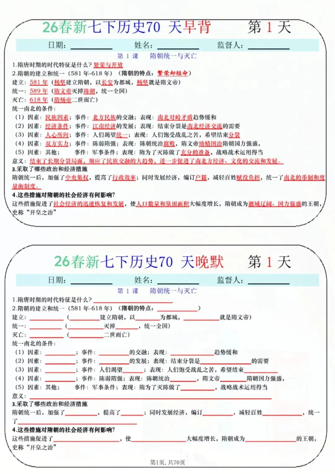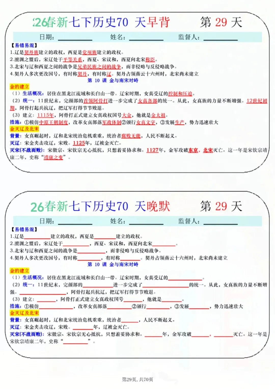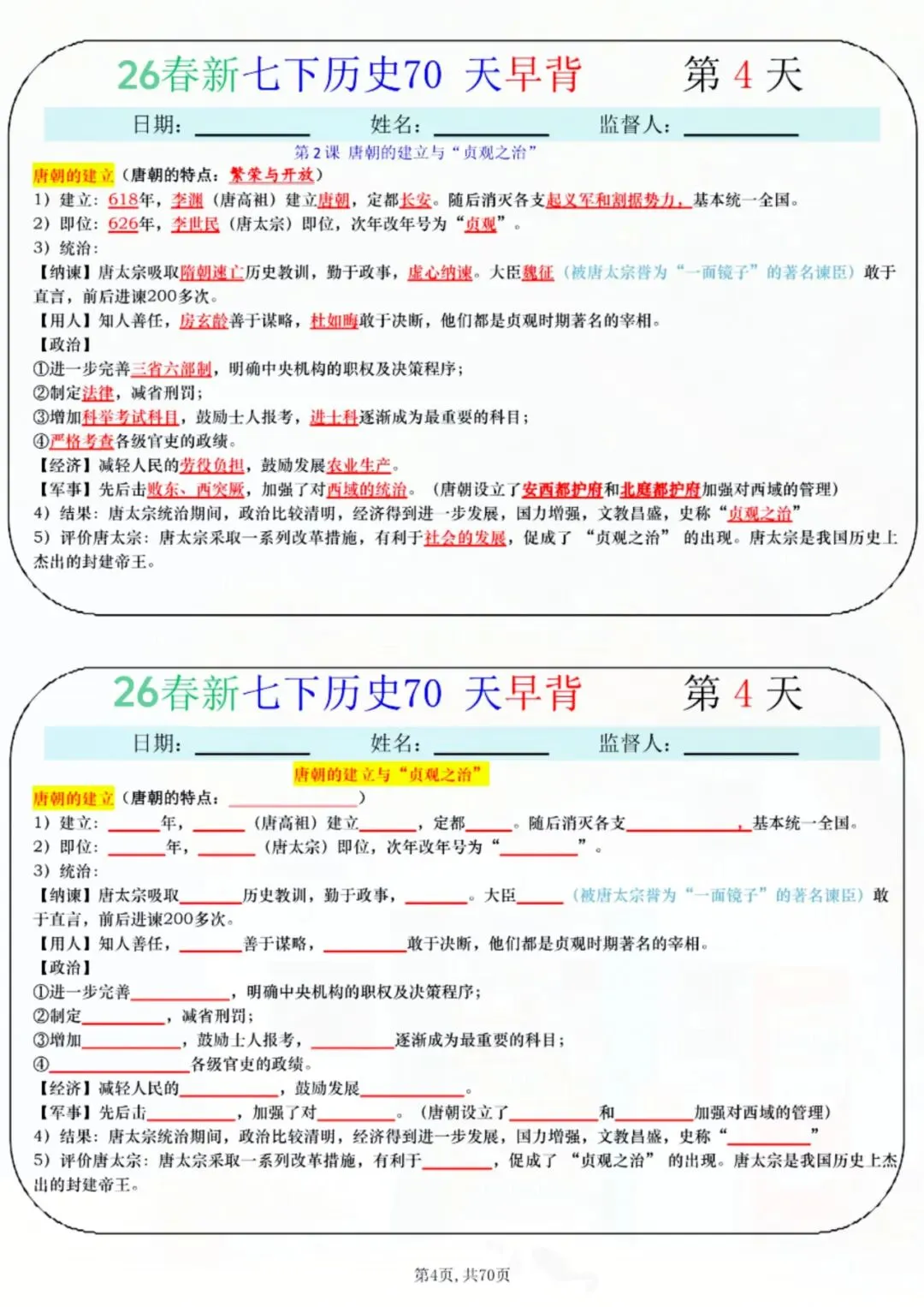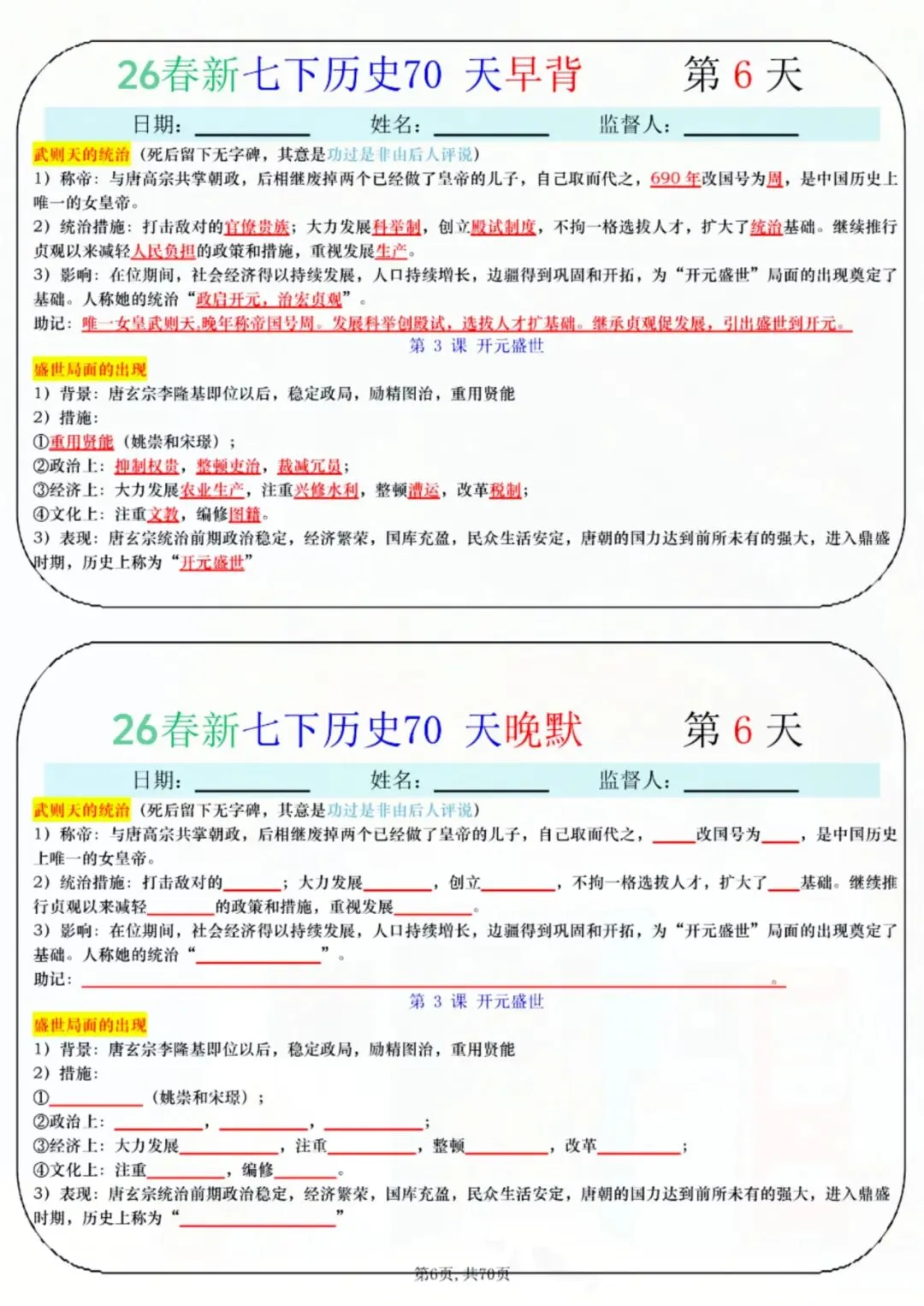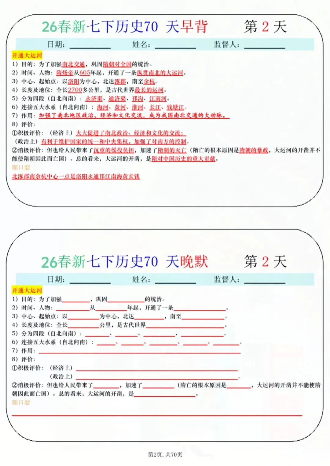 今天老师给大家整理了:七年级下册历史 70 天早背晚默 电子版可打印!