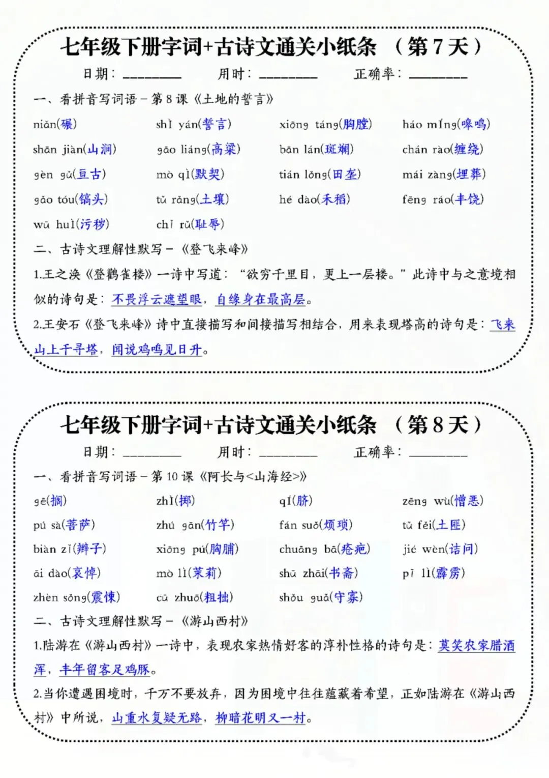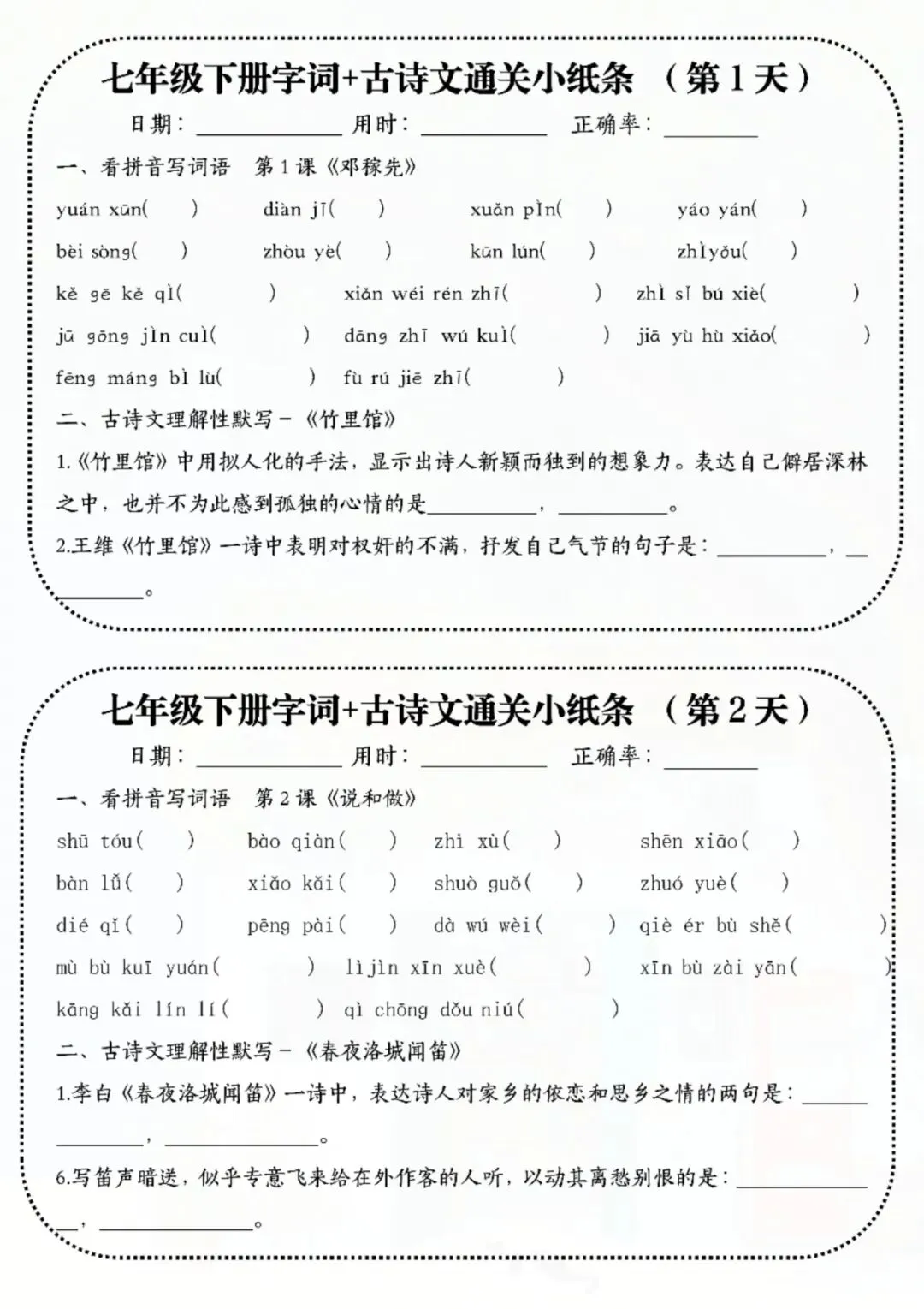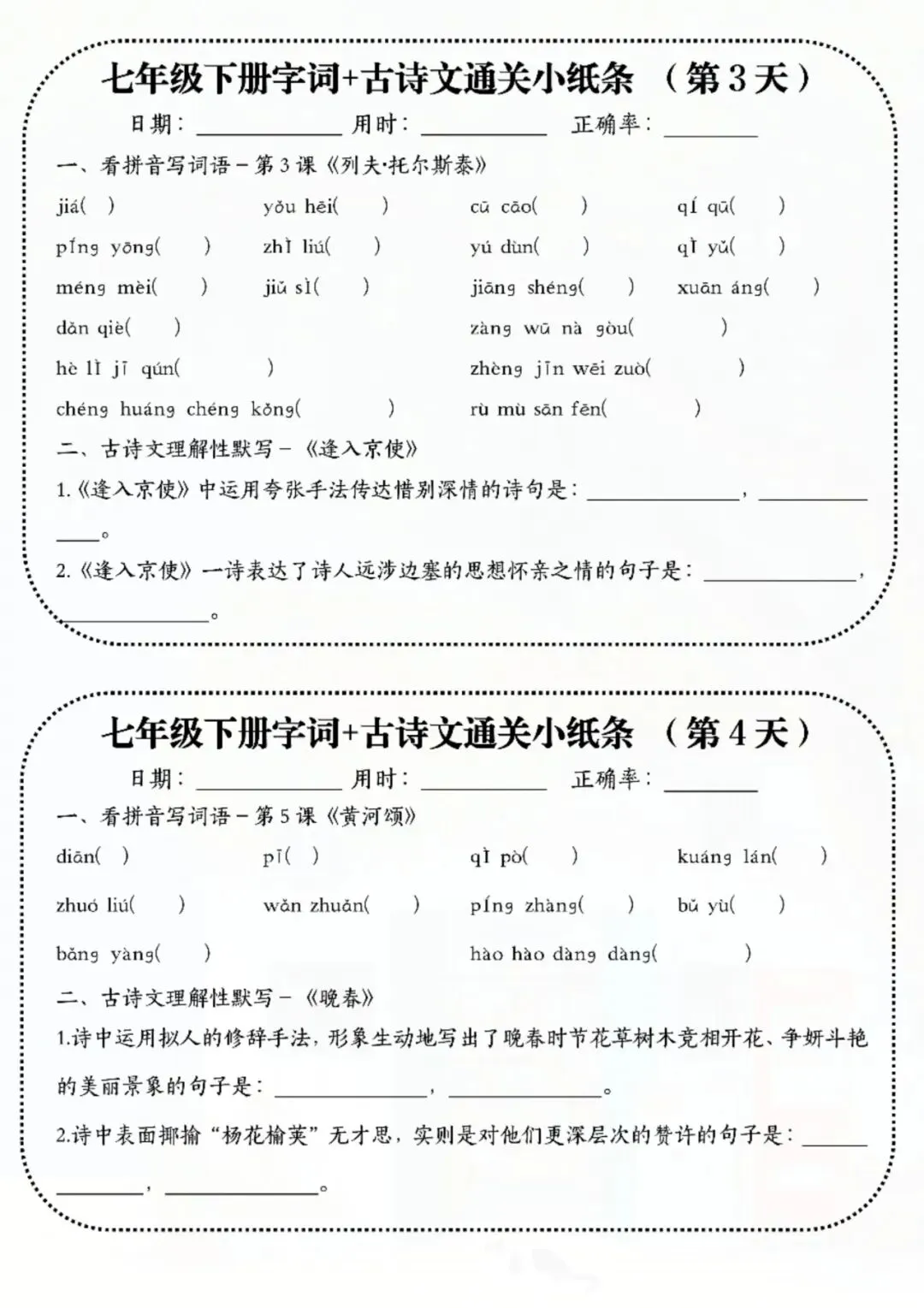 七年级下册语文字词古诗睡前默写 电子版可打印