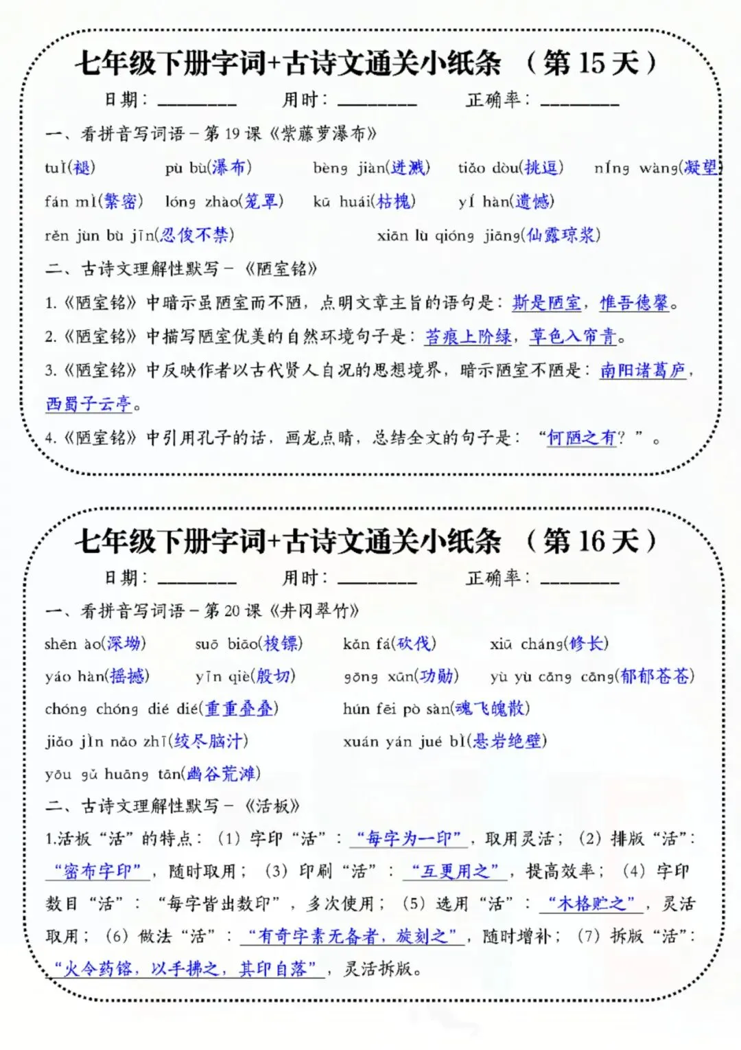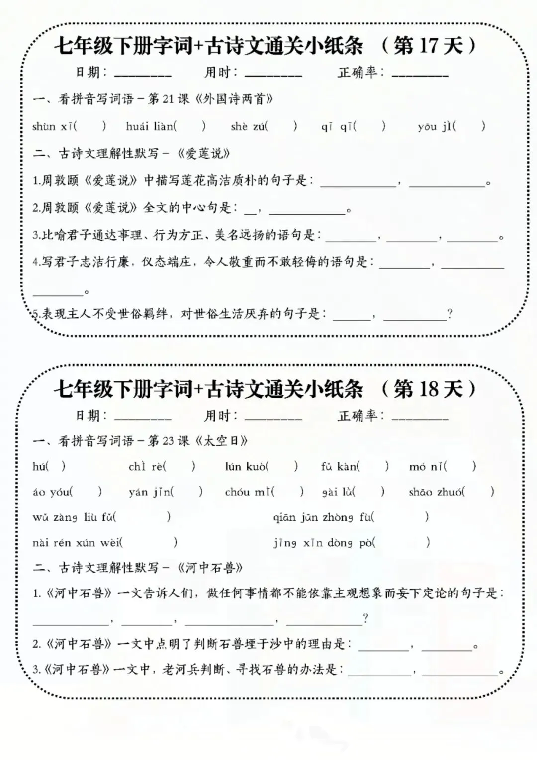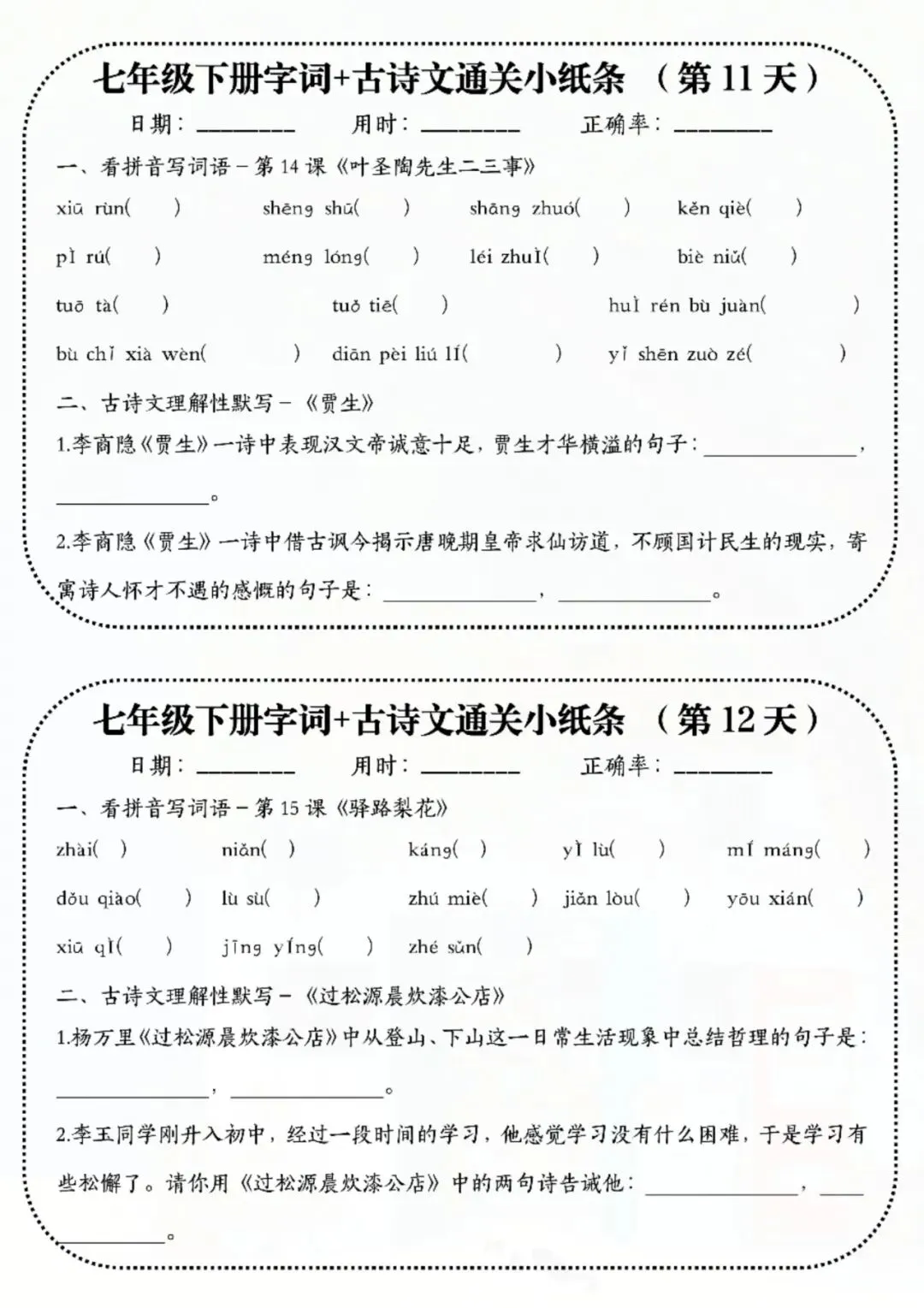 七年级下册语文字词古诗睡前默写 电子版可打印