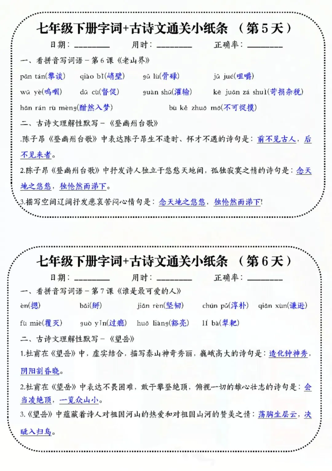 今天老师给大家整理了:七年级下册语文字词古诗睡前默写 电子版可打印!