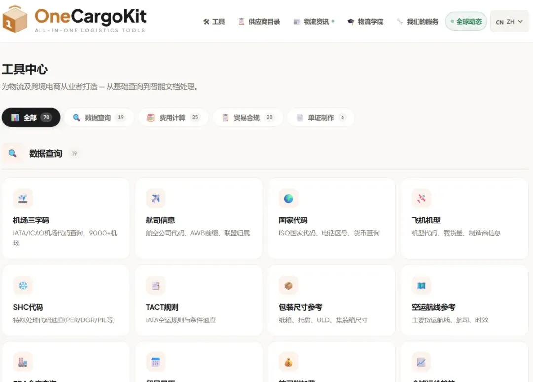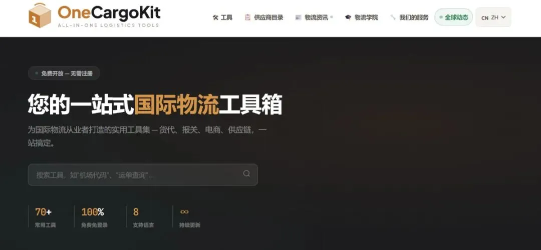 先说结论: onecargokit.com , 70 个免费物流工具,不用注册, 8 种语言,可以直接用。