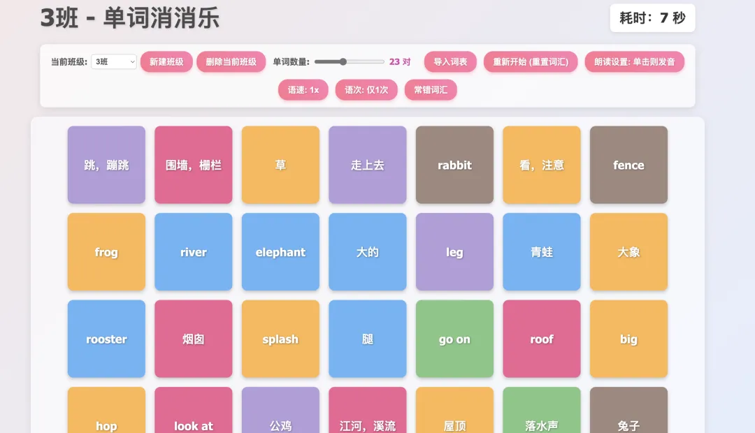 我做了一个网页版的单词消消乐小游戏——屏幕上随机出现英文单词和中文释义,学生需要在限定时间内找到正确的配对,点击消除。配对正确有得分动画,配对错误会扣分。