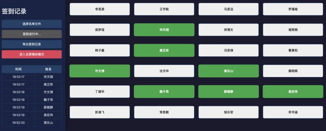 现在我做了一个签到页面,投影到大屏上,学生进教室自己点一下自己的名字就行。谁来了谁没来,一目了然,甚至还能记录时间,点错了还能撤销。