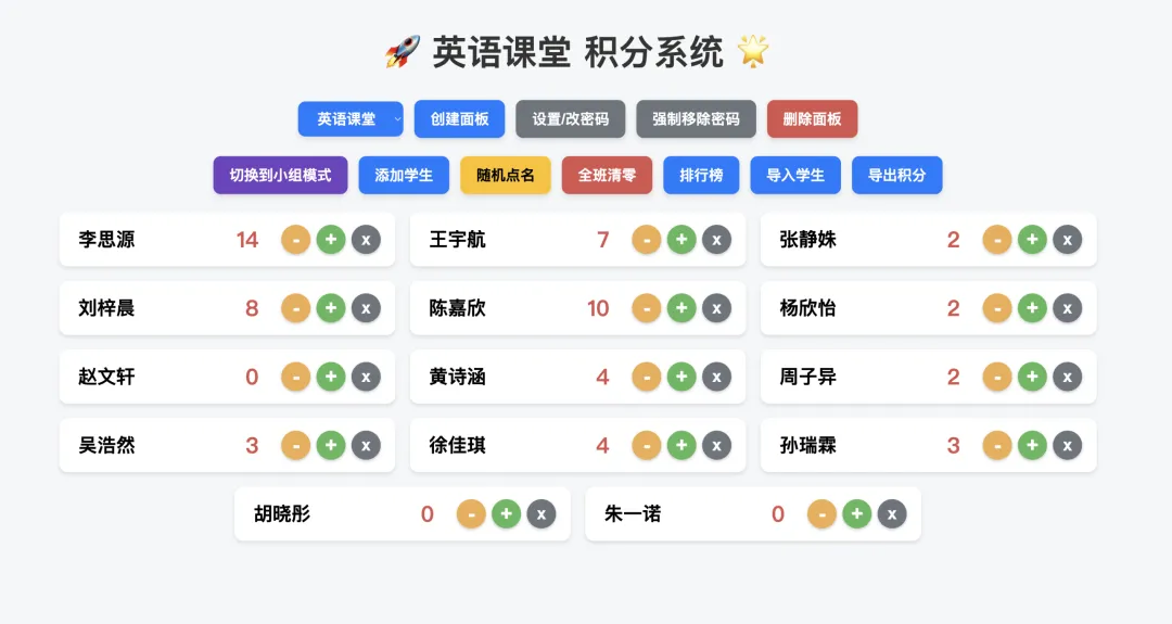 每个学生有初始积分,上课回答问题加分、作业优秀加分、违纪扣分,全部实时显示在大屏上。积分排名每周更新,前三名有小奖励。
