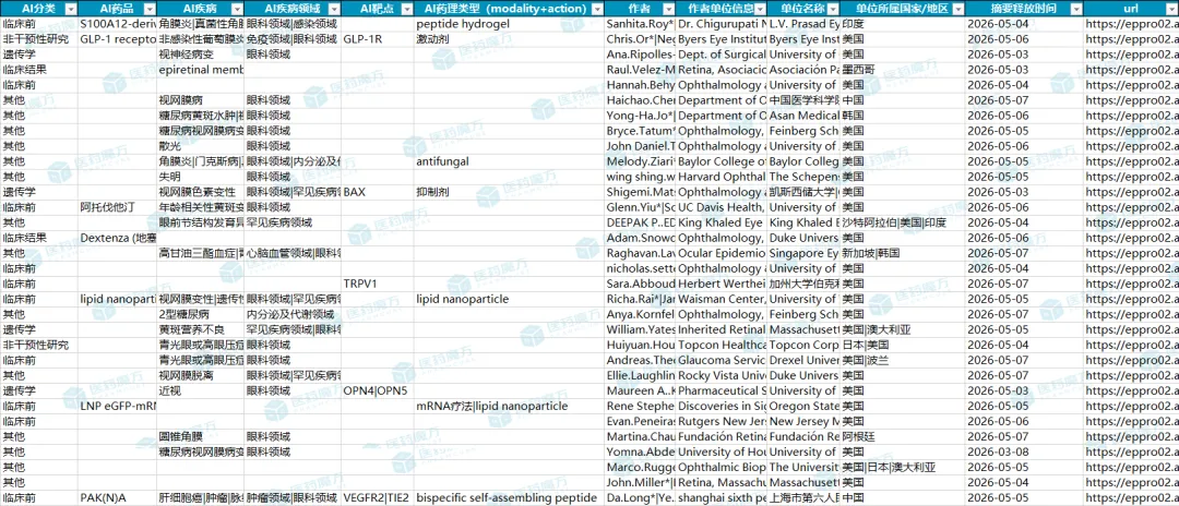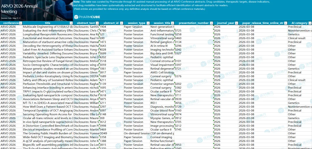 近日,ARVO官方公布了本次大会摘要内容。医药魔方对本届大会超6400条摘要内容数据进行了整合清洗,借助AI抽取了每条摘要涉及的药品、靶点、机构、适应症以及药理类型等关键字段,汇总形成了ARVO摘要数据合集(提供中英双语版本)。