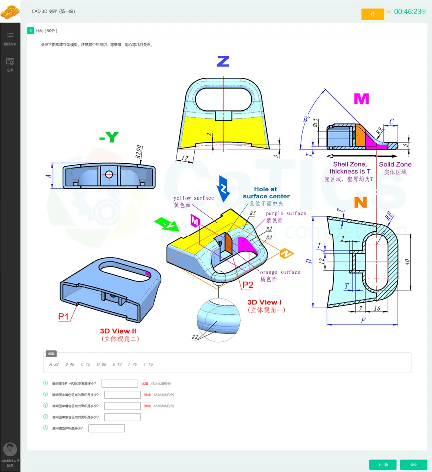 考试系统界面如下图所示。题图采用箭头导向方式,便于纯三维造型考核视图。题图下方为参数区,每个学生即便抽取到一个题目,参数也可能不同。答题区域,采用比对填空,所填数值相对正确答案,在指定容差范围内(比如相对误差正负0.5%)视为正确。部分小题提供了试错机会。
