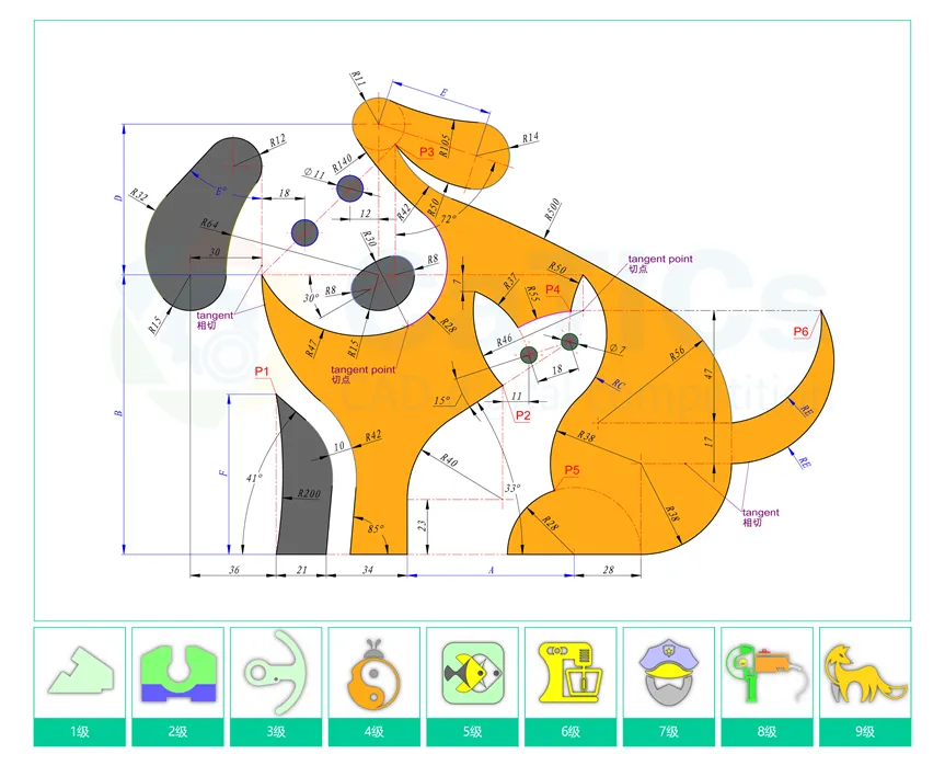 下图是2D方向的题库,从线条数量、弧线过渡、绘图技巧等方面,逐步加大难度等级。题目素材覆盖机械、工业设计、广告标识设计等方向。