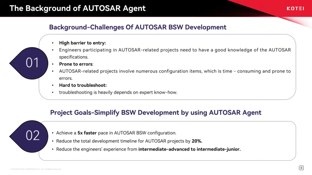 在汽车软件开发中,芯片更换、新车型适配及主机厂定制需求通常需要高级工程师主导,但此类人才市场供给有限。通过将高级工程师的技术经验和行业知识图谱化,AUTOSAR专家Agent可辅助中级工程师完成复杂适配任务,项目初期便设定了开发效率提升5倍、开发周期缩短20%的目标。