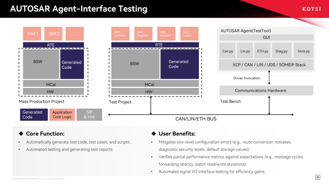 为保障开发成果的质量,该Agent实现了实体测试台架与虚拟测试环境的同步生成与适配,由Agent驱动双环境互联互通,完成全流程自动化测试。公司联合客户在量产项目的区域控制器BSW配置工作中开展试点,同时适配EB与Vector两大协议栈,对智能需求分析、自动化配置、测试执行及专家问答等核心功能进行实战验证,取得了显著成效。