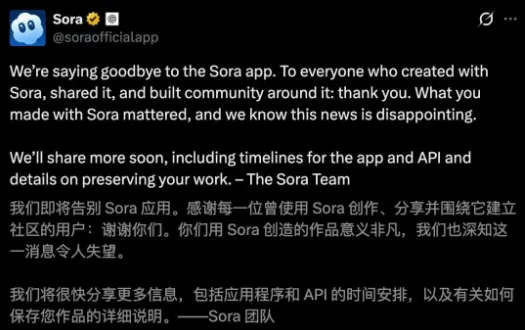 Sora 官方团队已发布告别声明,确认将终止 Sora 全链路服务,覆盖独立消费端 App、面向开发者的 API 接口,以及 ChatGPT 内置的视频生成功能。