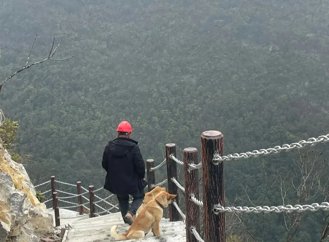 偶遇山巅监工与他的忠犬,听他说每日往返爬山三趟,每趟耗时一个半小时,步履不停的坚守,是山野间最动人的风景。We met a supervisor and his loyal dog on the summit. He said he climbs the mountain three round trips every day, one and a half hours each time. His unceasing perseverance is the most touching scenery in the mountains.云雾中的山间步道若隐若现,工人正加紧建设二号观景台,无人机穿梭运送物资,忙碌的身影,让山野多了几分温暖的烟火气。The mountain path in the clouds is looming. Workers are speeding up the construction of the No.2 viewing platform, and drones shuttle to deliver materials. The busy figures add a bit of warm fireworks to the mountains.